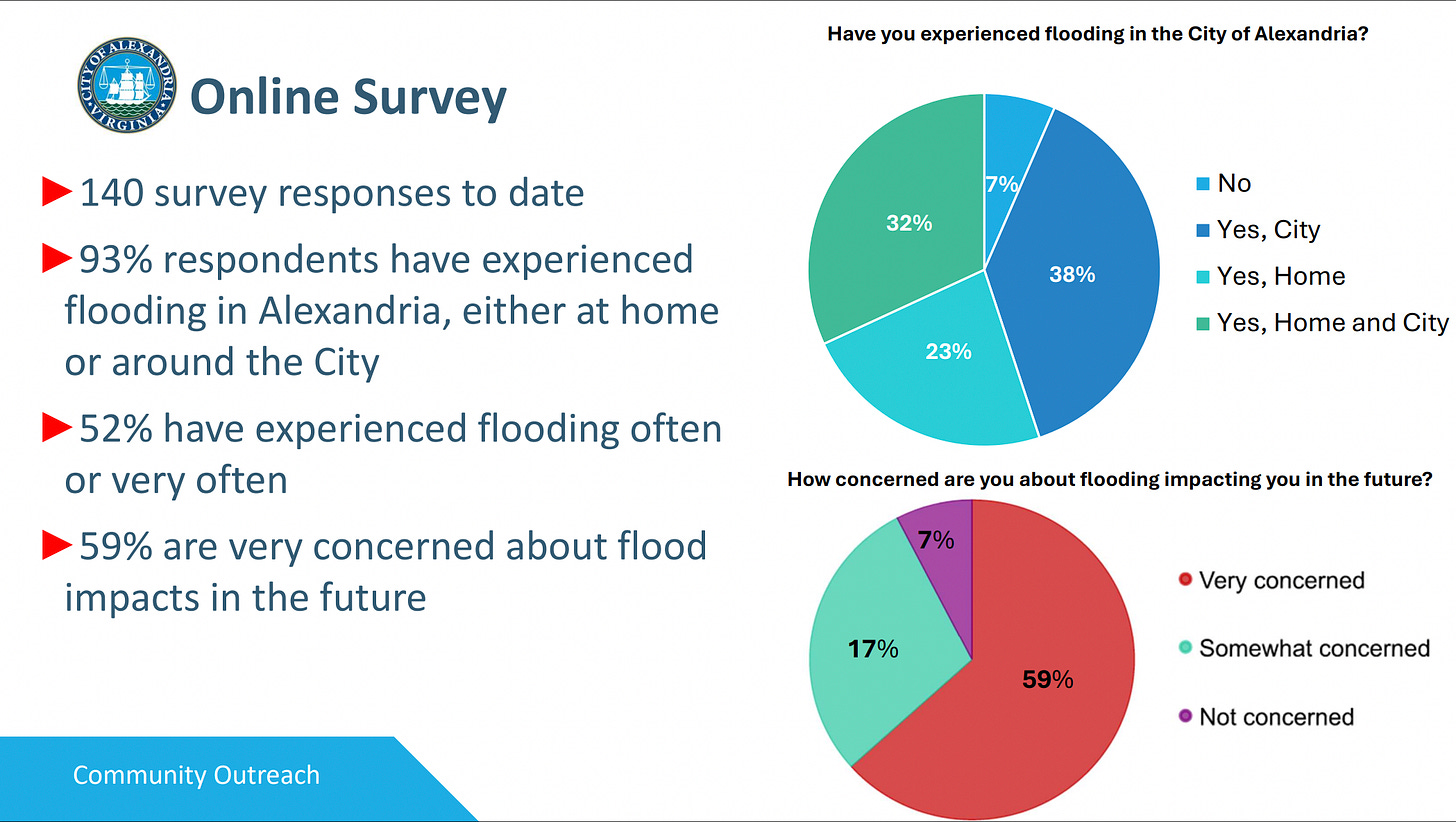 An online community survey has collected 140 responses, with 93% of respondents reporting flooding experiences in Alexandria. Fifty-two percent reported experiencing flooding often or very often. The survey has mapped 128 flood locations citywide and remains open through Nov. 30 at bit.ly/AlexCommunitySurvey.