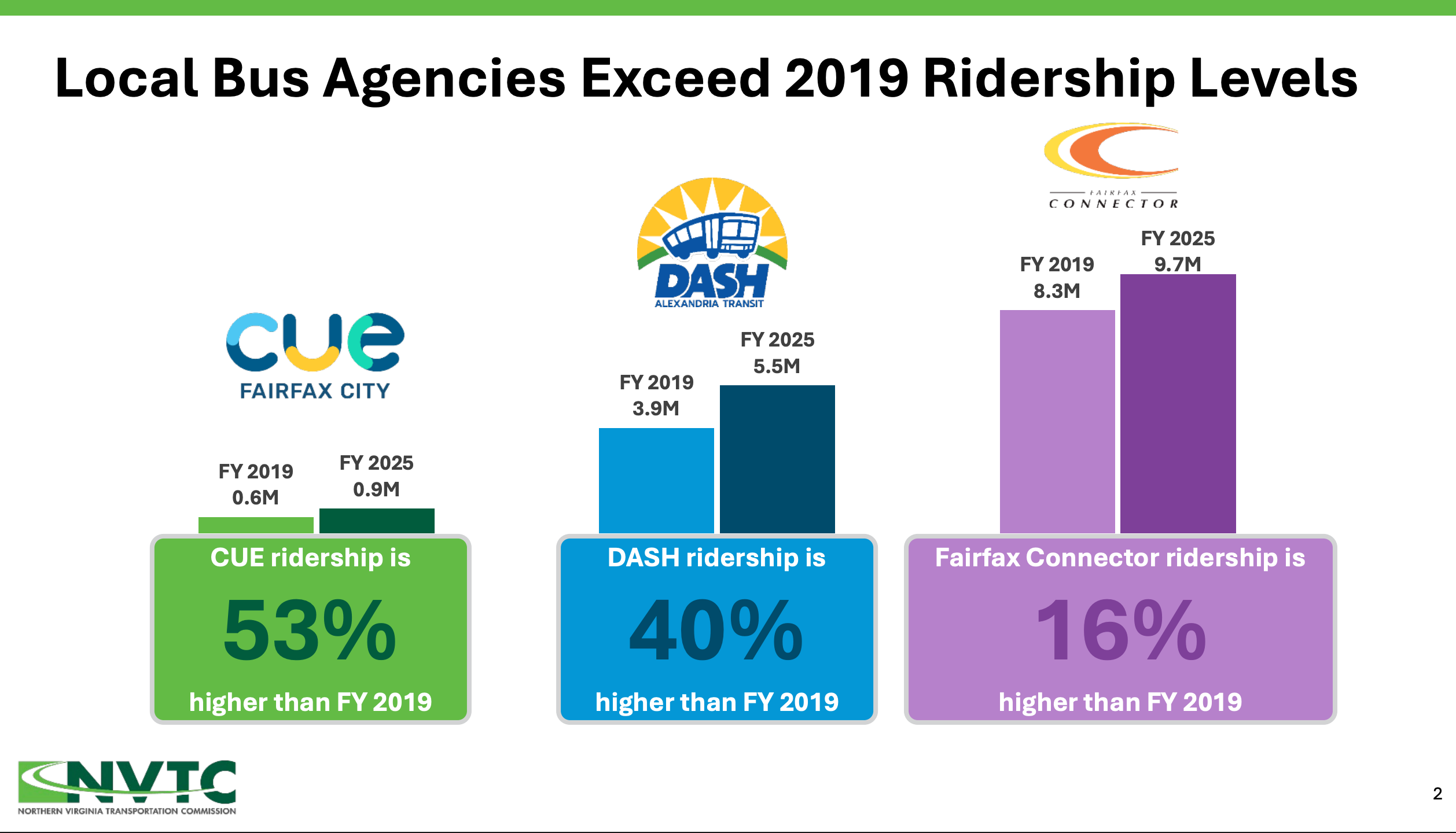 The trend extends across Northern Virginia. Metro has sustained over 50 consecutive months of ridership growth, while bus services regionwide show similar increases.