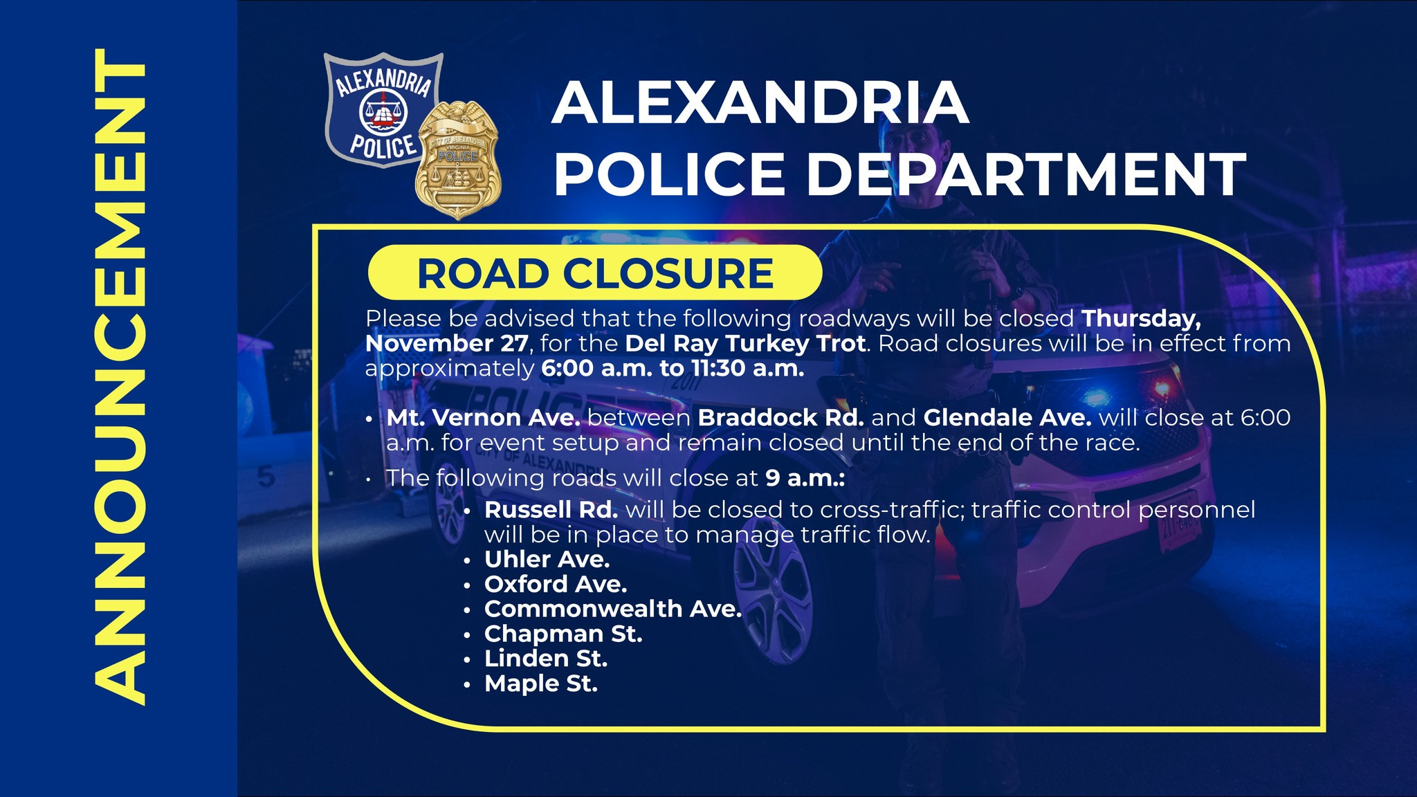 The Alexandria Police Department announced several Del Ray roadways will be closed Thursday, November 27, for the annual race. Closures will be in effect from approximately 6 a.m. to 11:30 a.m.