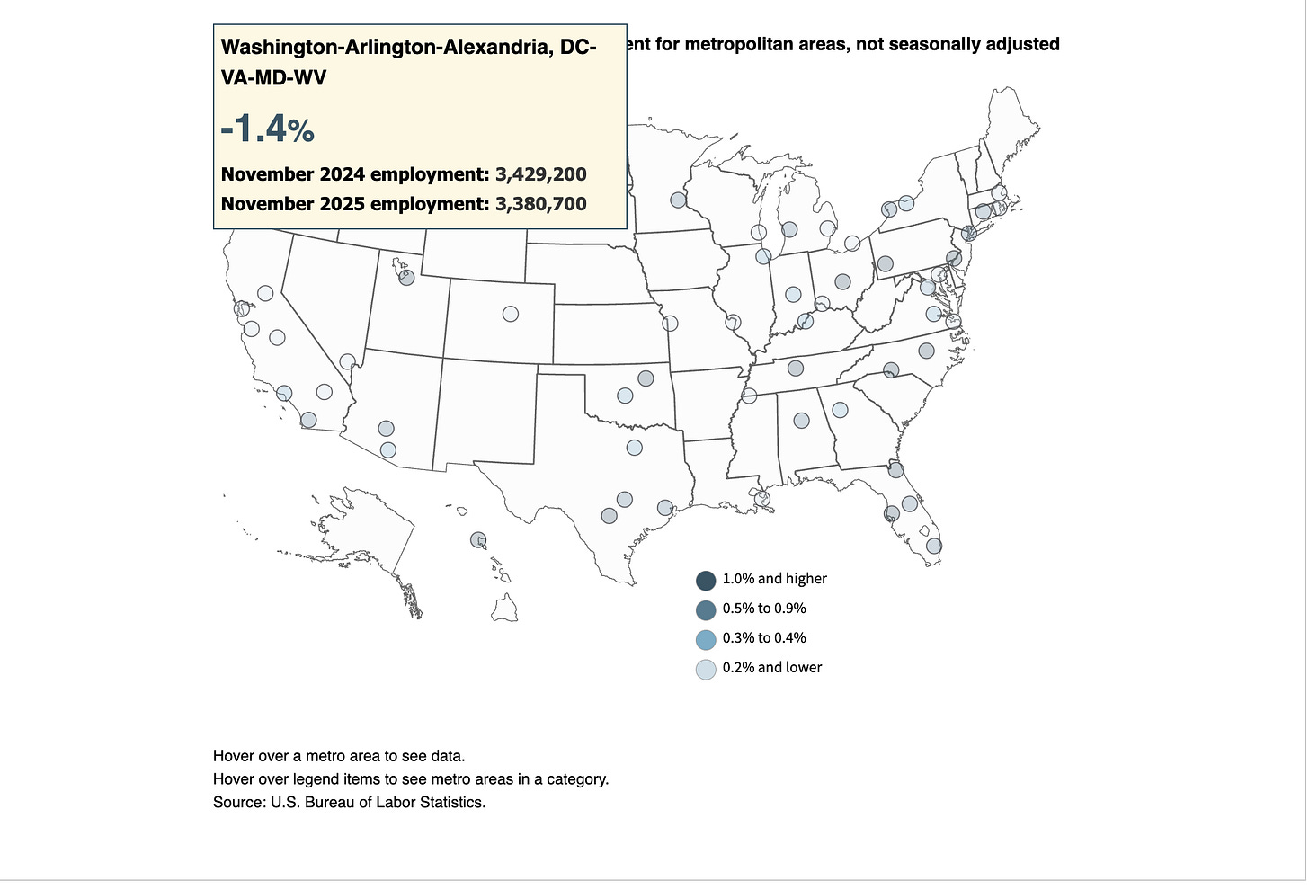 The BLS reported Tuesday in its Metropolitan Area Employment and Unemployment release that the DC metro lost approximately 48,500 jobs between November 2024 and November 2025 — a 1.4 percent drop. Among the nation’s 56 metropolitan areas with populations exceeding one million, it was the sole region to post a decline. Every other large metro was either growing or flat.
