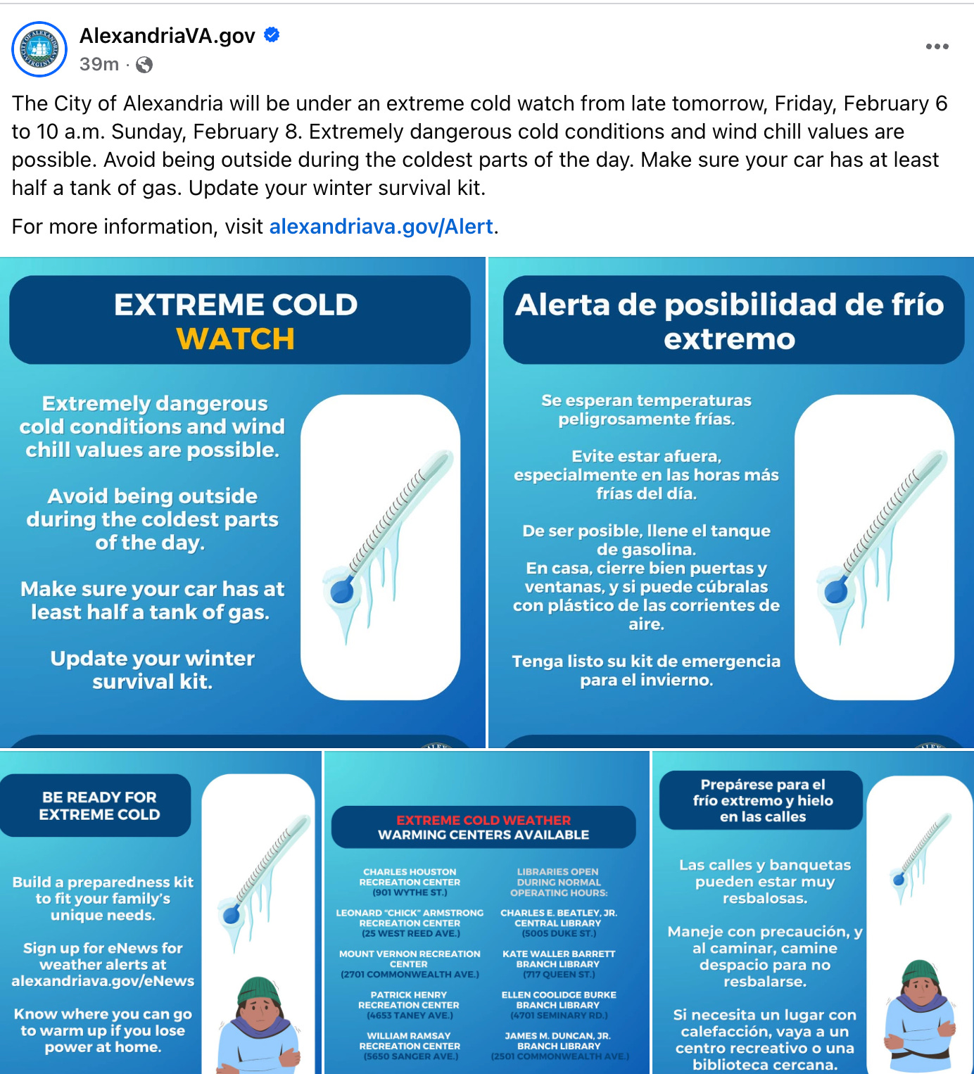 The city of Alexandria announced the approaching cold on its social media accounts Thursday afternoon in English and Spanish, urging residents to stay indoors during the coldest hours, keep vehicles at least half full of gas and update winter survival kits.