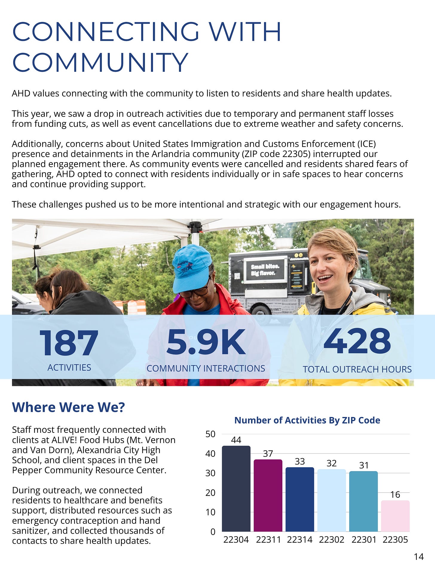 The report states that concerns about U.S. Immigration and Customs Enforcement presence and detainments in Arlandria interrupted planned engagement there. Community events were cancelled as residents shared fears of gathering, prompting staff to connect with residents individually or in safe spaces instead.
