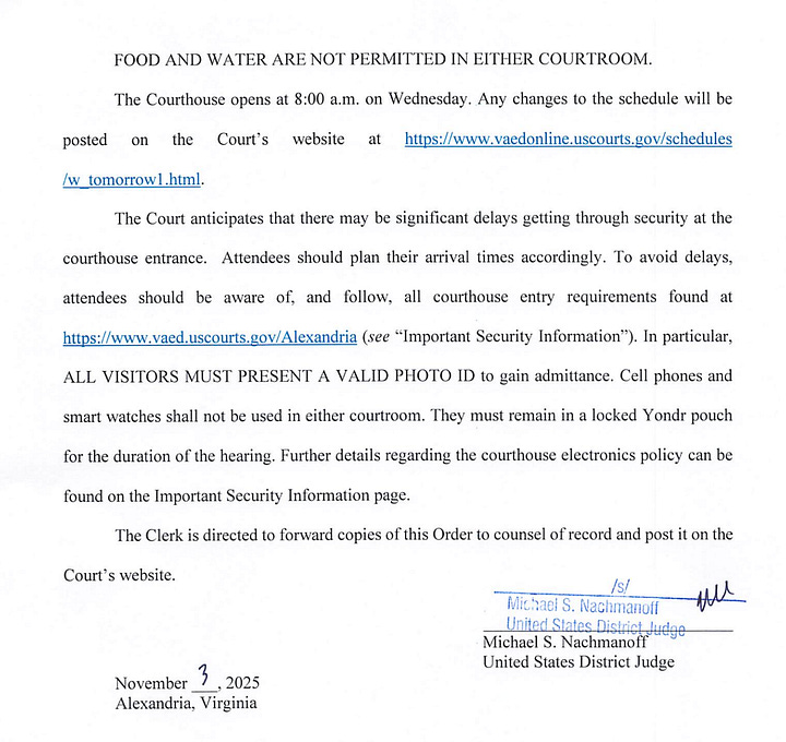 For capacity and security reasons, the hearing before Magistrate Judge William E. Fitzpatrick on November 5, 2025, at 10:00 a.m. is hereby moved to Courtroom 600 on the Sixth Floor of the Albert V. Bryan United States Courthouse. Because seating capacity will be limited, Courtroom 601 will be reserved and will serve as an overflow courtroom. Please see the Order for additional information.