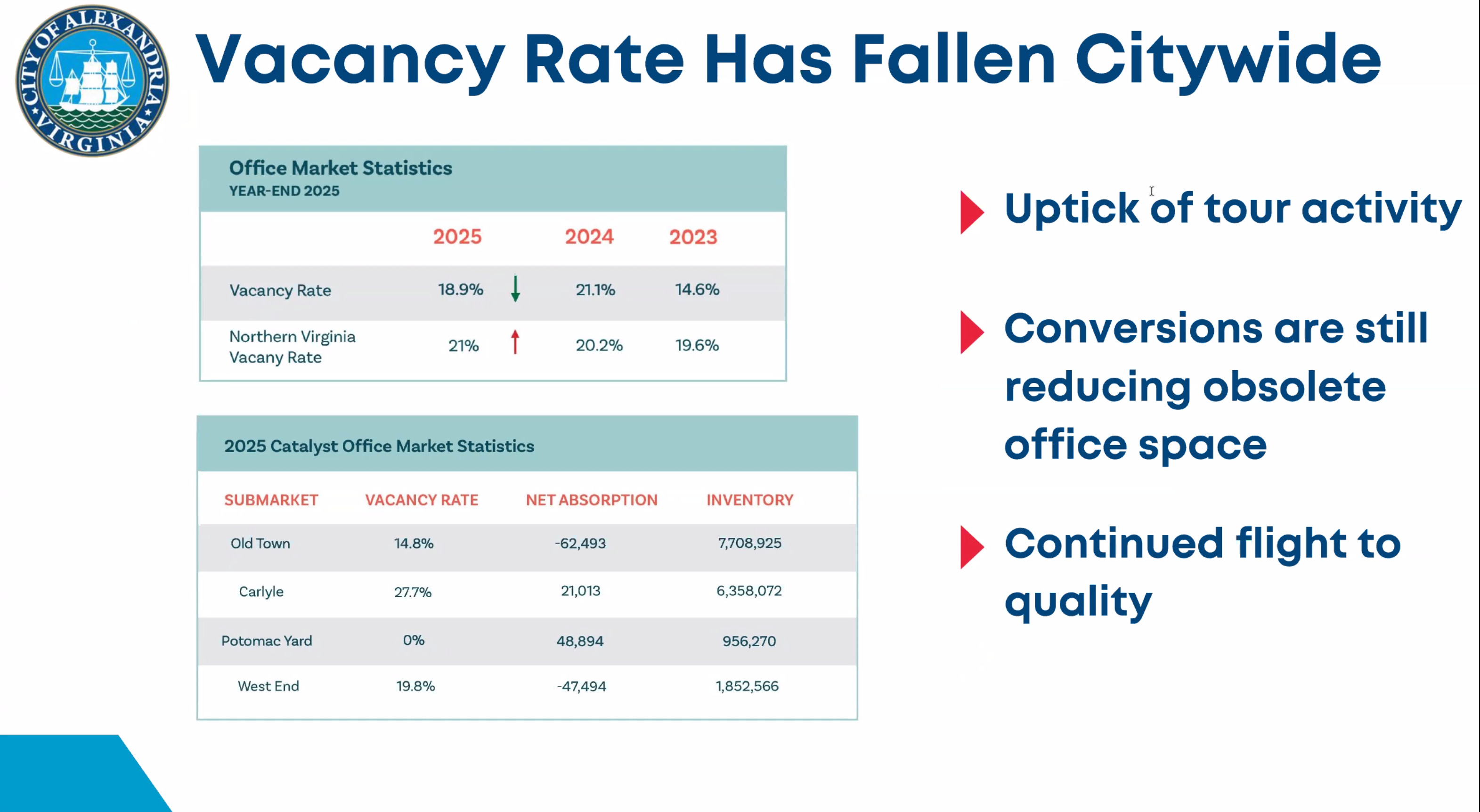 Alexandria’s office vacancy rate fell to 18.9 percent at year’s end — bucking a regional trend that has seen Northern Virginia’s vacancy rise to 21 percent — but local unemployment has ticked up as federal job cuts continue to ripple through the economy.