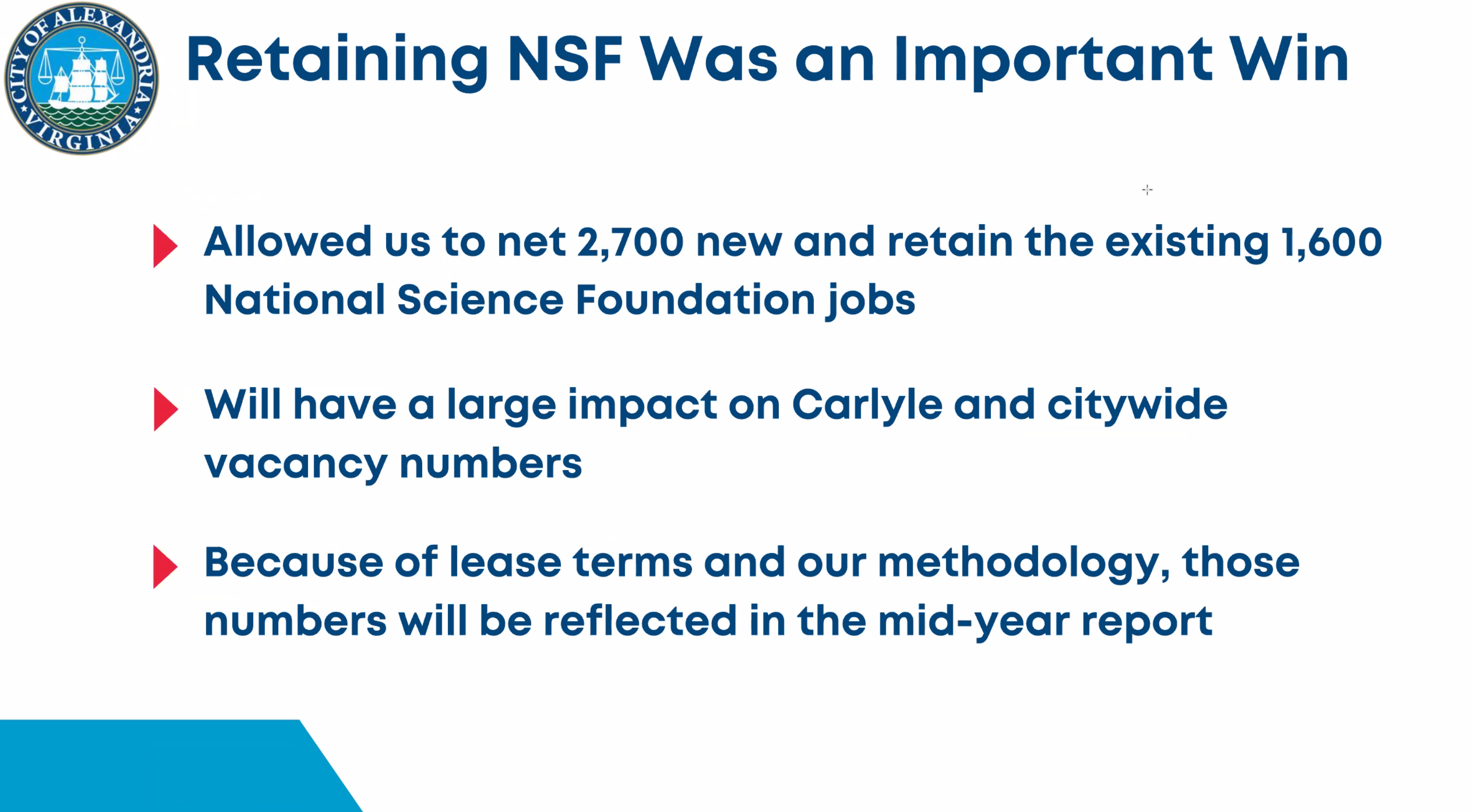 The Carlyle numbers are expected to improve significantly when the National Science Foundation’s lease is reflected in the next report. NSF announced in December it would remain in Alexandria, occupying 386,000 square feet in a former Patent and Trademark Office building. That absorption alone could reduce citywide vacancy by 2.5 percent and Carlyle vacancy by 6 percent.