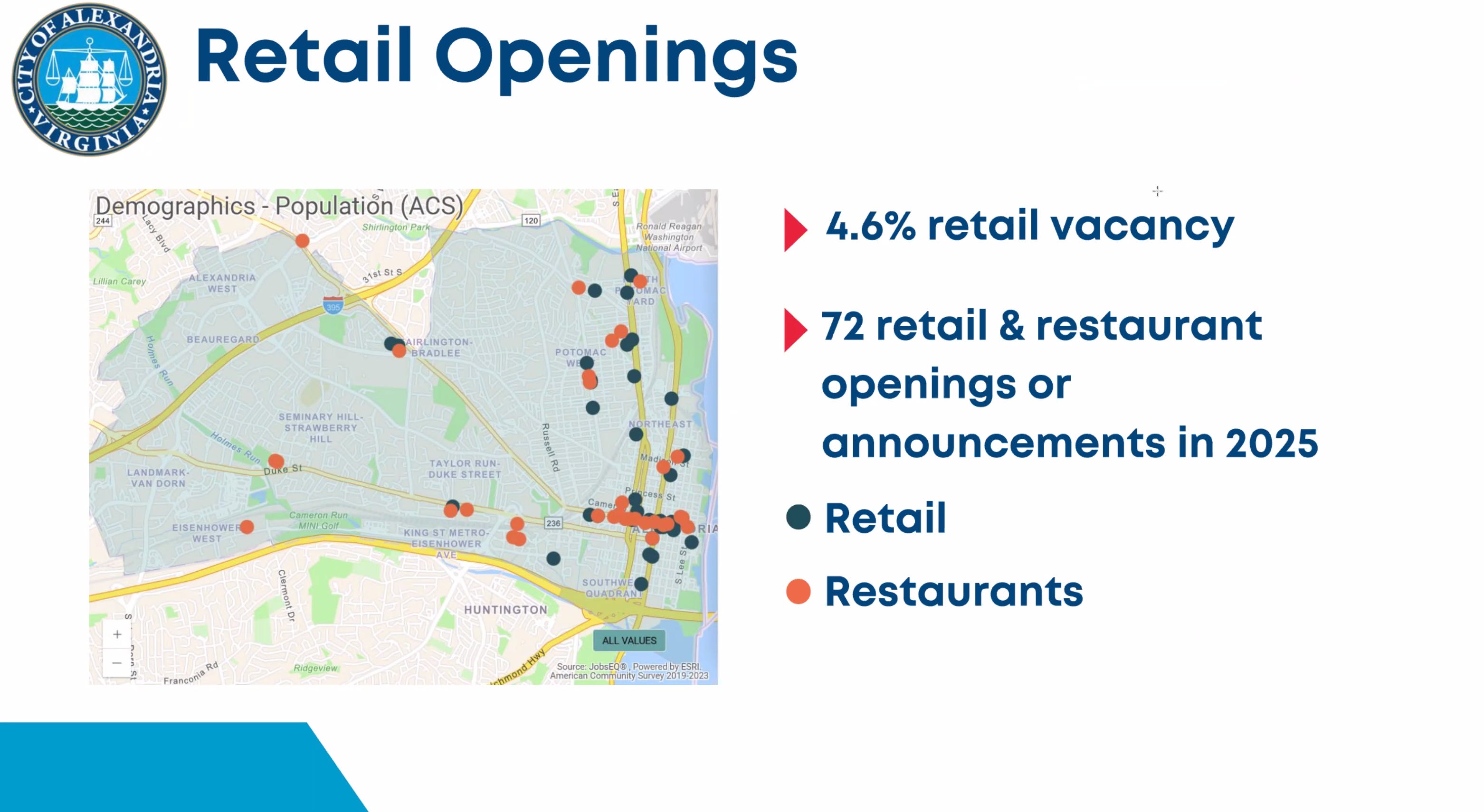 But Councilman John Chapman noted a geographic imbalance: most new retail activity is concentrated along the “crescent curve” from Old Town through Potomac Yard, with little action in the West End.