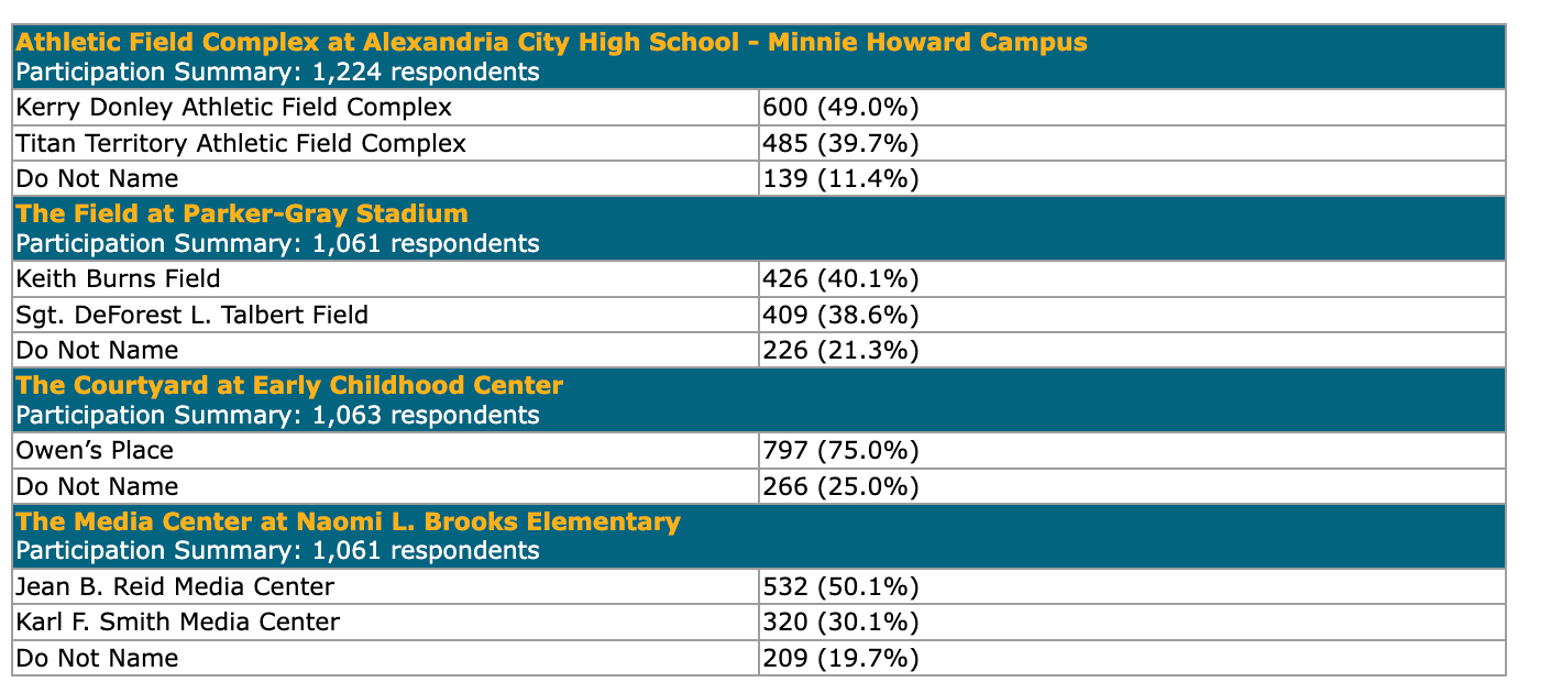 Across all four polls, the option to leave spaces unnamed drew significant support — as high as 25% for the Early Childhood Center courtyard and 21.3% for the Parker-Gray field.