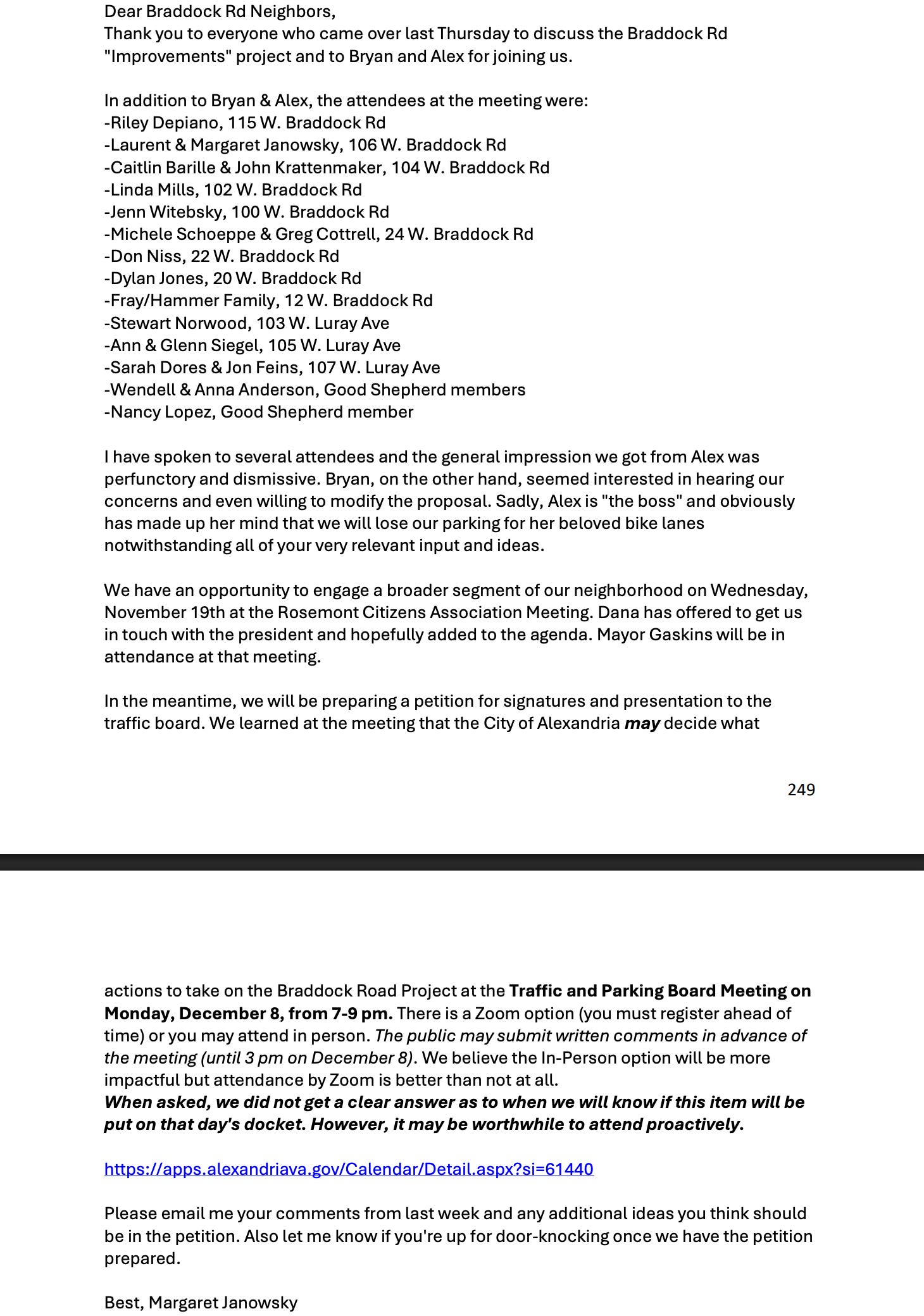 In the February letter, the Janowskys accuse Carroll of not actually considering “ANY input from the residents of Braddock Rd” and claim the community engagement process that included 10 public meetings and nearly 900 survey responses was merely “perfunctory and performative.”
