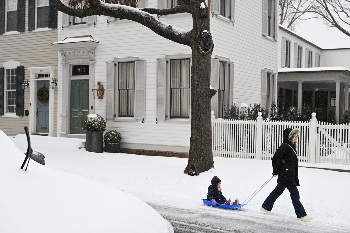 ALEXANDRIA, VA- JANUARY 25: Courtney DeThomas pulls her daughter, Antonia, 3, in a sled as winter storm Fern hits the region on Sunday January 25, 2026 in Alexandria, VA. (Photo by Matt McClain/The Washington Post via Getty Images)