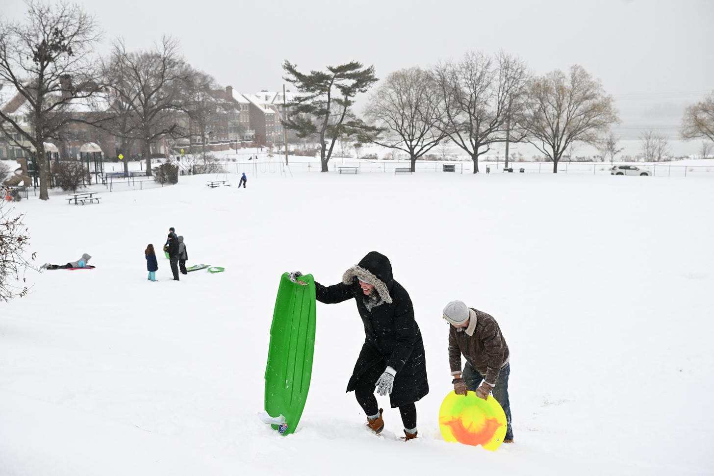 ALEXANDRIA, VA- JANUARY 25: Ellen Goodyear and her husband Charlie Goodyear play in the snow in Windmill Hill Park as winter storm Fern hits the region on Sunday January 25, 2026 in Alexandria, VA. (Photo by Matt McClain/The Washington Post via Getty Images)