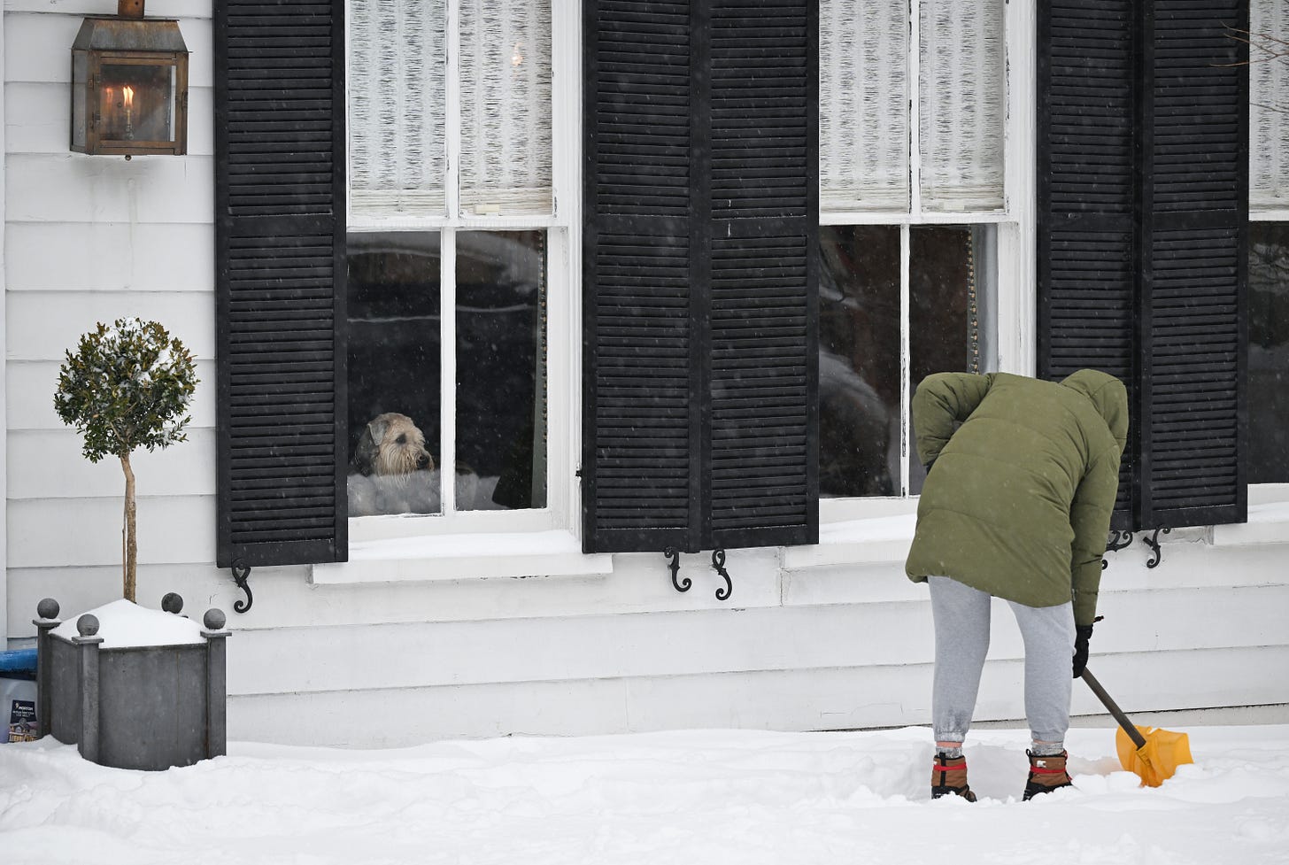 ALEXANDRIA, VA- JANUARY 25: Leslie Golden shovels outside her home as her dog, Granby watches from inside as winter storm Fern hits the region on Sunday January 25, 2026 in Alexandria, VA. (Photo by Matt McClain/The Washington Post via Getty Images)