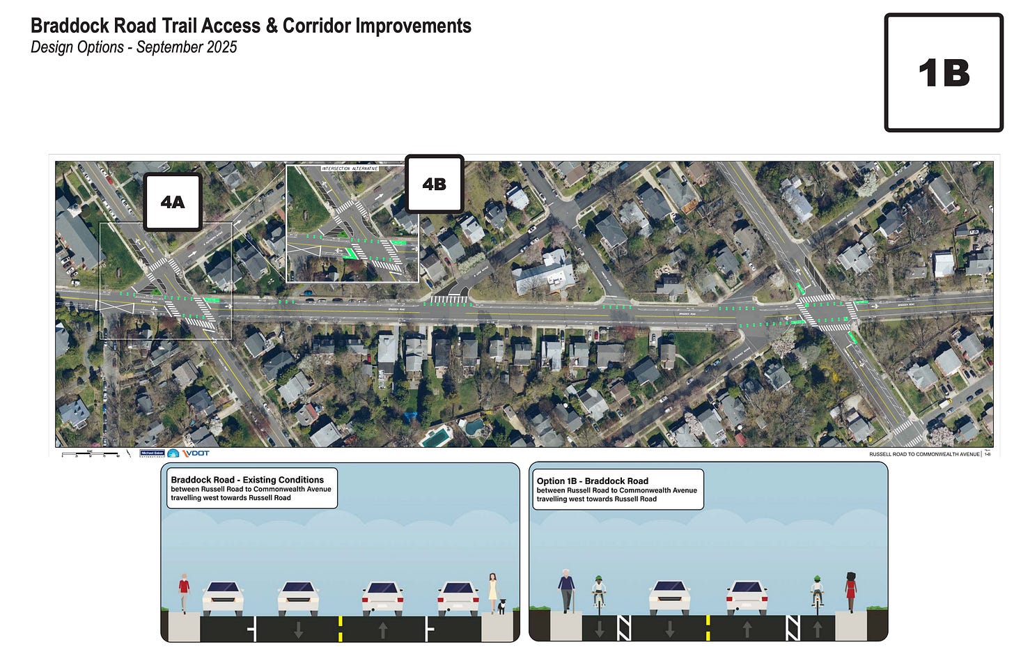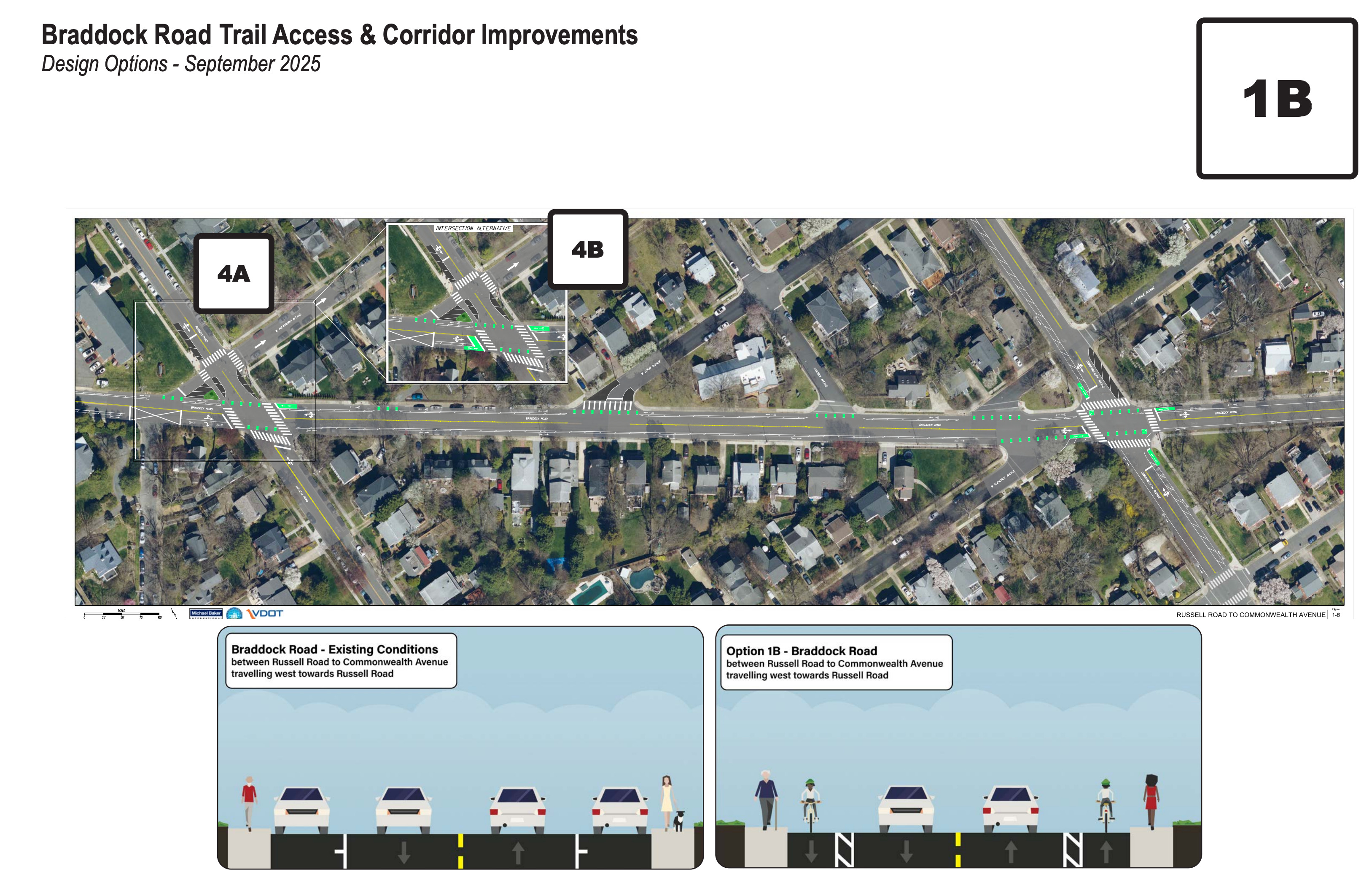 The city’s Braddock Road Trail Access and Corridor Improvements Project includes multiple design options for different segments of the corridor. The November resolution opposed Options 1A and 1B, which would create protected bike lanes by removing parking between Russell Road and Commonwealth Avenue.