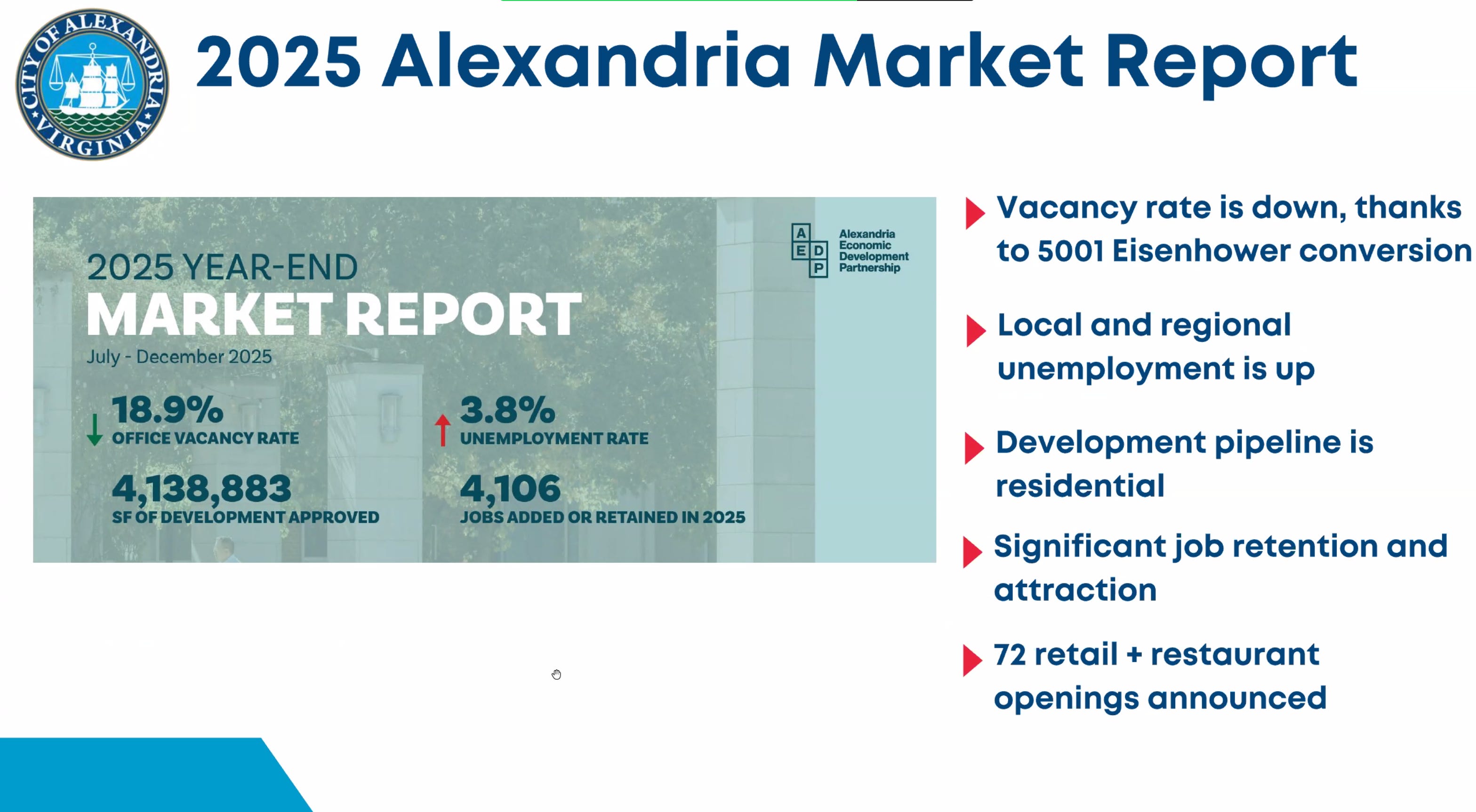 Alexandria’s office vacancy rate fell to 18.9% at year’s end — bucking a regional trend that has seen Northern Virginia’s vacancy rise to 21% — but local unemployment has climbed to 3.8% as federal job cuts continue to ripple through the economy. The data came Tuesday night during the Alexandria Economic Development Partnership’s year-end report to council, setting the stage for a budget season shaped by federal uncertainty.