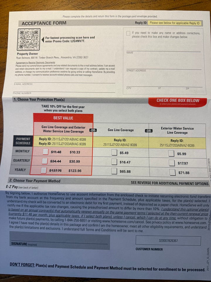 HomeServe isn’t a scam. But the marketing approach — utility branding, frequent mailings, urgent deadlines — mirrors the tactics the utility’s own guidance tells customers to scrutinize.