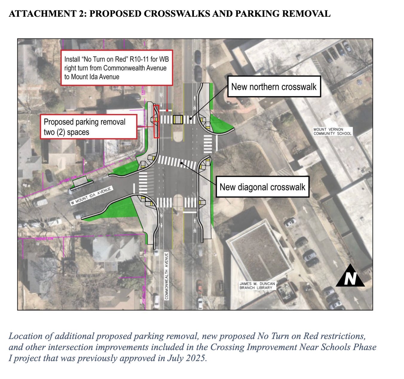 Staff is asking the board to approve the removal of two parking spaces at the intersection of Commonwealth Avenue and Mount Ida Avenue in Del Ray to accommodate new crosswalks serving Mount Vernon Community School, the James M. Duncan Branch Library, and the Mount Vernon Recreation Center. The project would add a northern crosswalk and a diagonal crossing at an intersection that currently lacks a crossing guard.