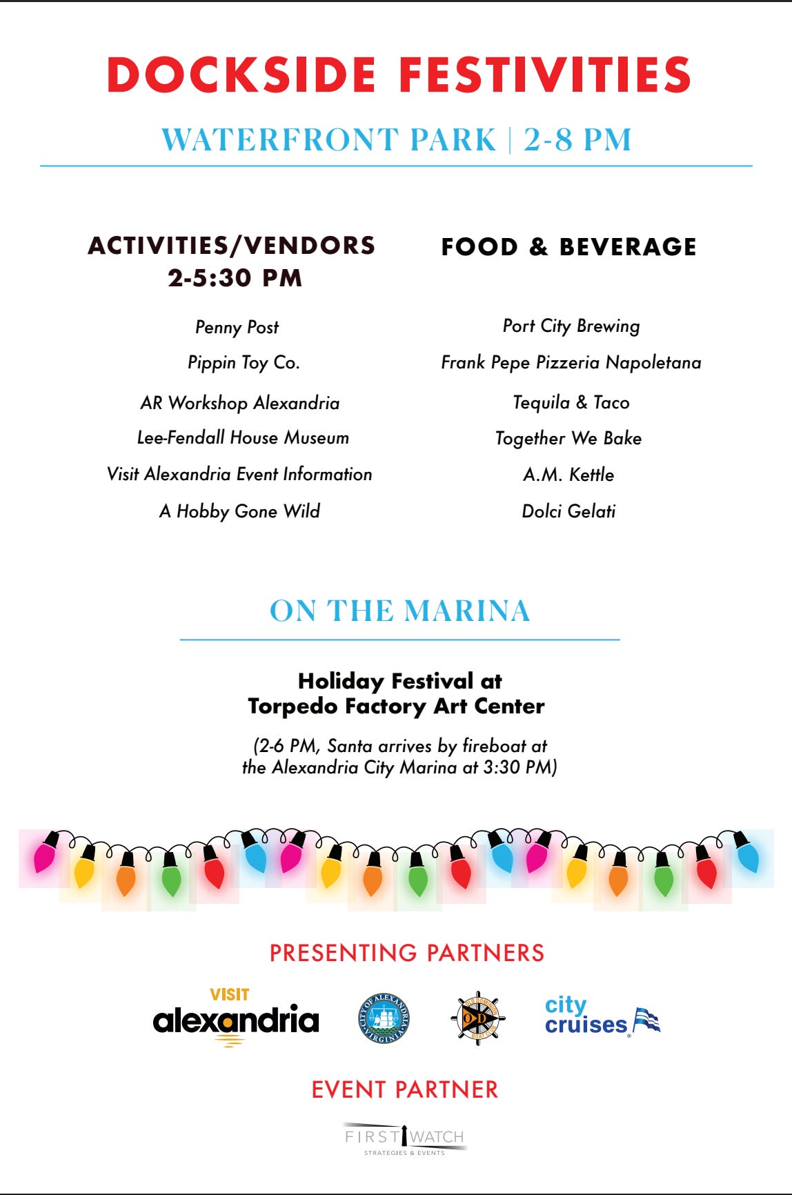 Dockside festivities run from 2 to 8 p.m. at Waterfront Park, featuring local vendors, children’s activities, and food from Port City Brewing, Frank Pepe Pizzeria Napoletana, Tequila & Taco, and others. The Torpedo Factory Art Center hosts a holiday festival from 2 to 6 p.m., with Santa arriving by fireboat at 3:30 p.m.