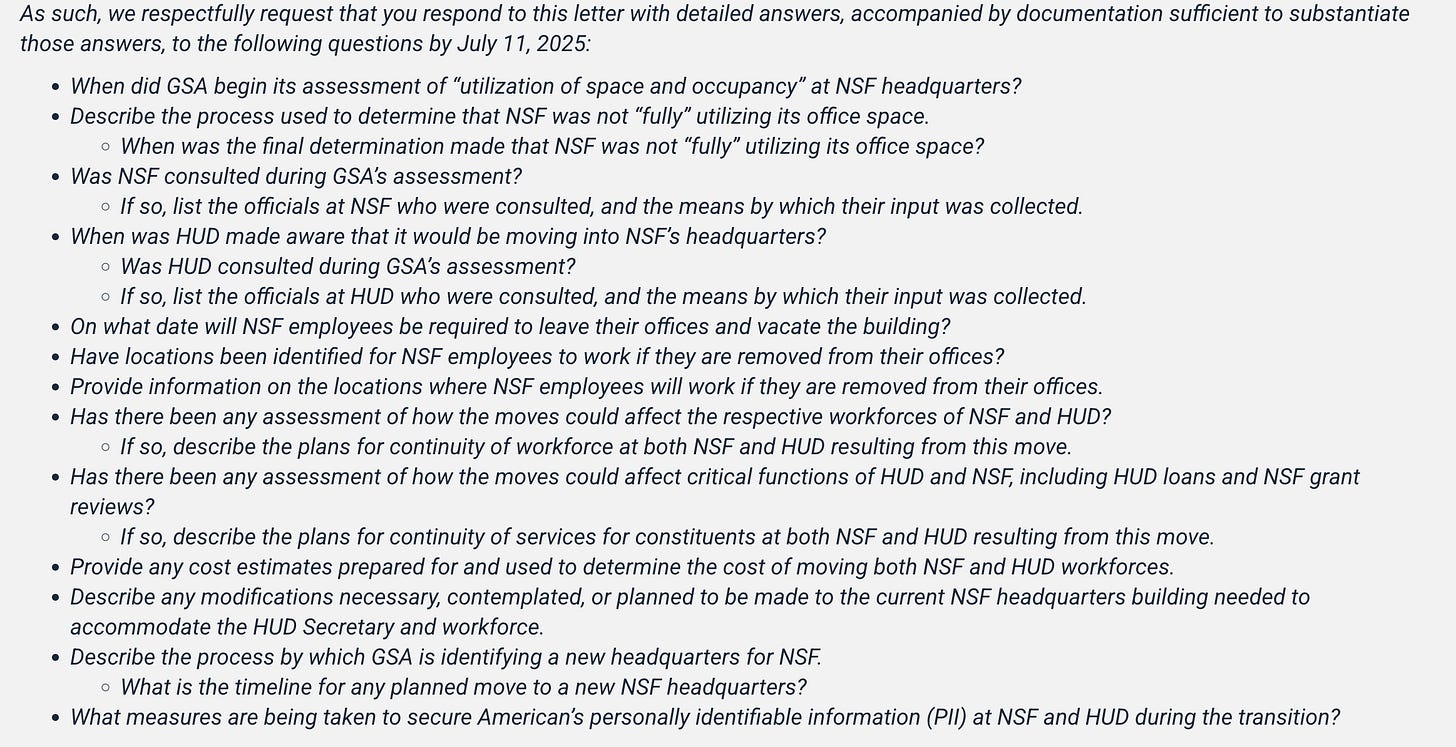 GSA’s two-page response outlined the rationale for relocating HUD into NSF’s Eisenhower Avenue building, citing projected savings of $500 million in deferred maintenance costs and increased building utilization under the USE IT Act, but did not provide specific answers to many of the questions, including cost estimates, timelines and details about which officials were consulted.