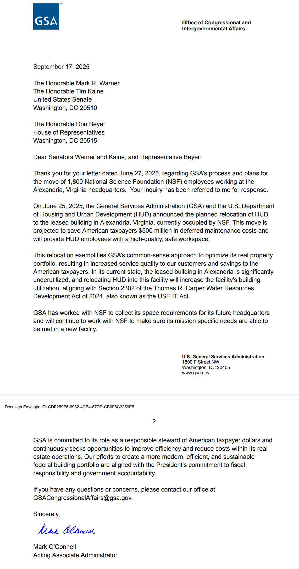Warner, along with Sen. Tim Kaine and Rep. Don Beyer, had requested detailed answers to 19 questions about GSA’s decision-making process, projected costs, coordination with NSF and HUD, and plans for accommodating affected employees.