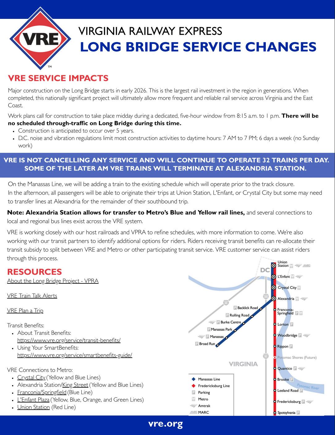 The service changes accommodate construction on three connected projects: the Long Bridge Project, the Alexandria Fourth Track project and VRE’s L’Enfant station project.