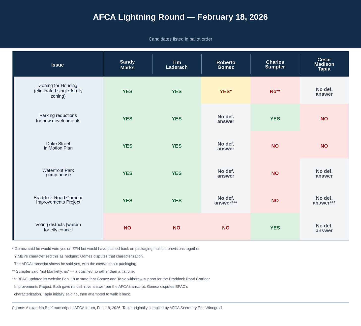 Each candidate was asked to vote yes or no on six specific policies. Table compiled by AFCA Secretary Erin Winograd and cross-referenced against the Alexandria Brief’s full transcript of the event.