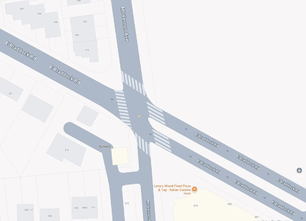 The Mount Vernon/Braddock intersection is one of three intersections where the Braddock Road project would consolidate turn lanes and create shorter pedestrian crossings. The Traffic and Parking Board voted 6-0 on February 24 to approve the project, which opponents have appealed to City Council.