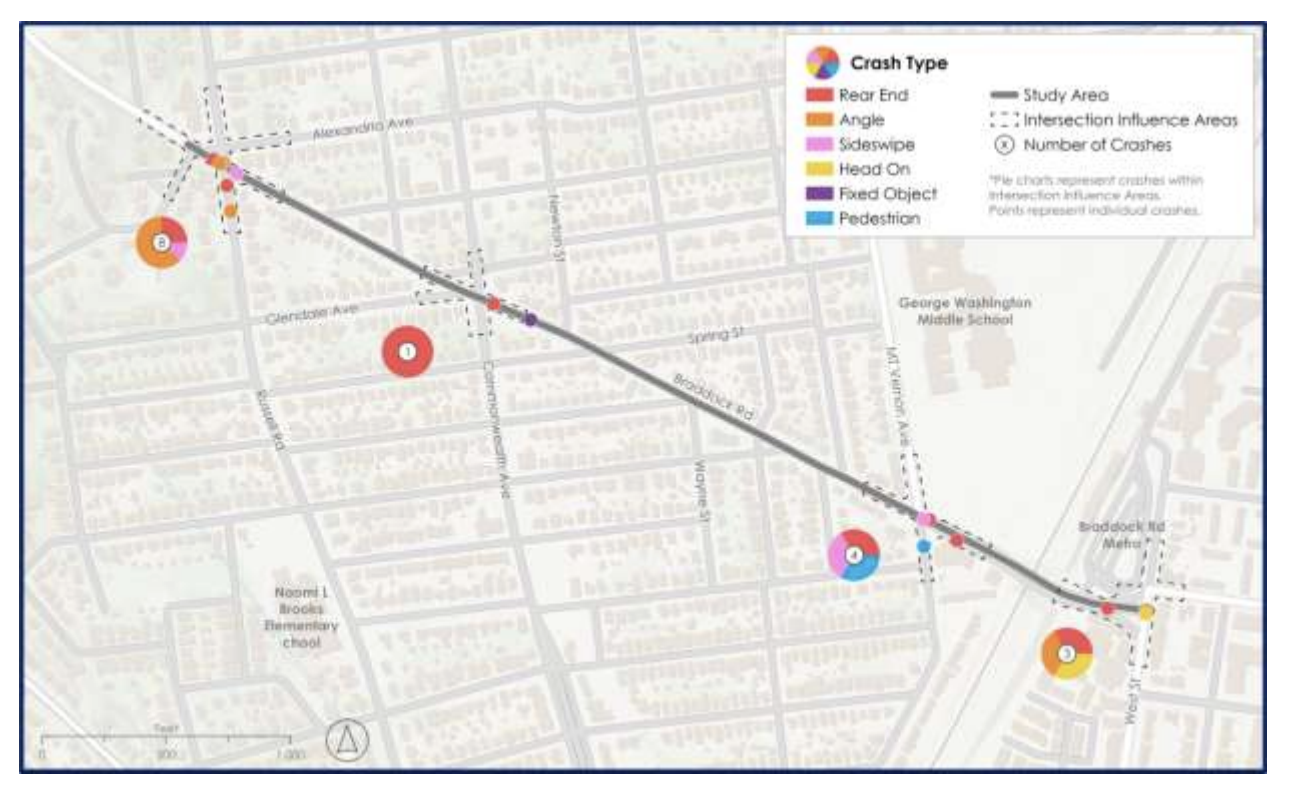 The city’s docket notes that between 2019 and 2023, there were 17 crashes in the project area, resulting in 8 injuries, including one involving a pedestrian. A woman was killed while walking at the intersection of Braddock Road and Commonwealth Avenue in 2015.
