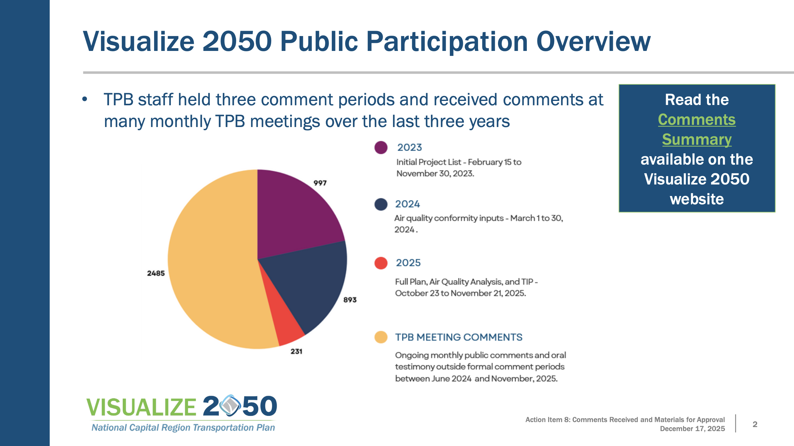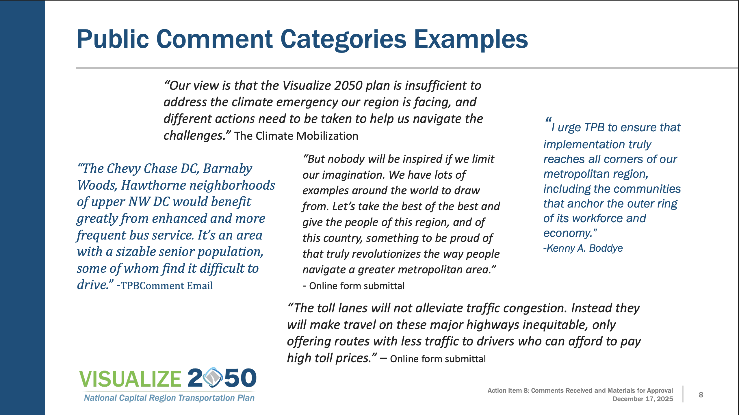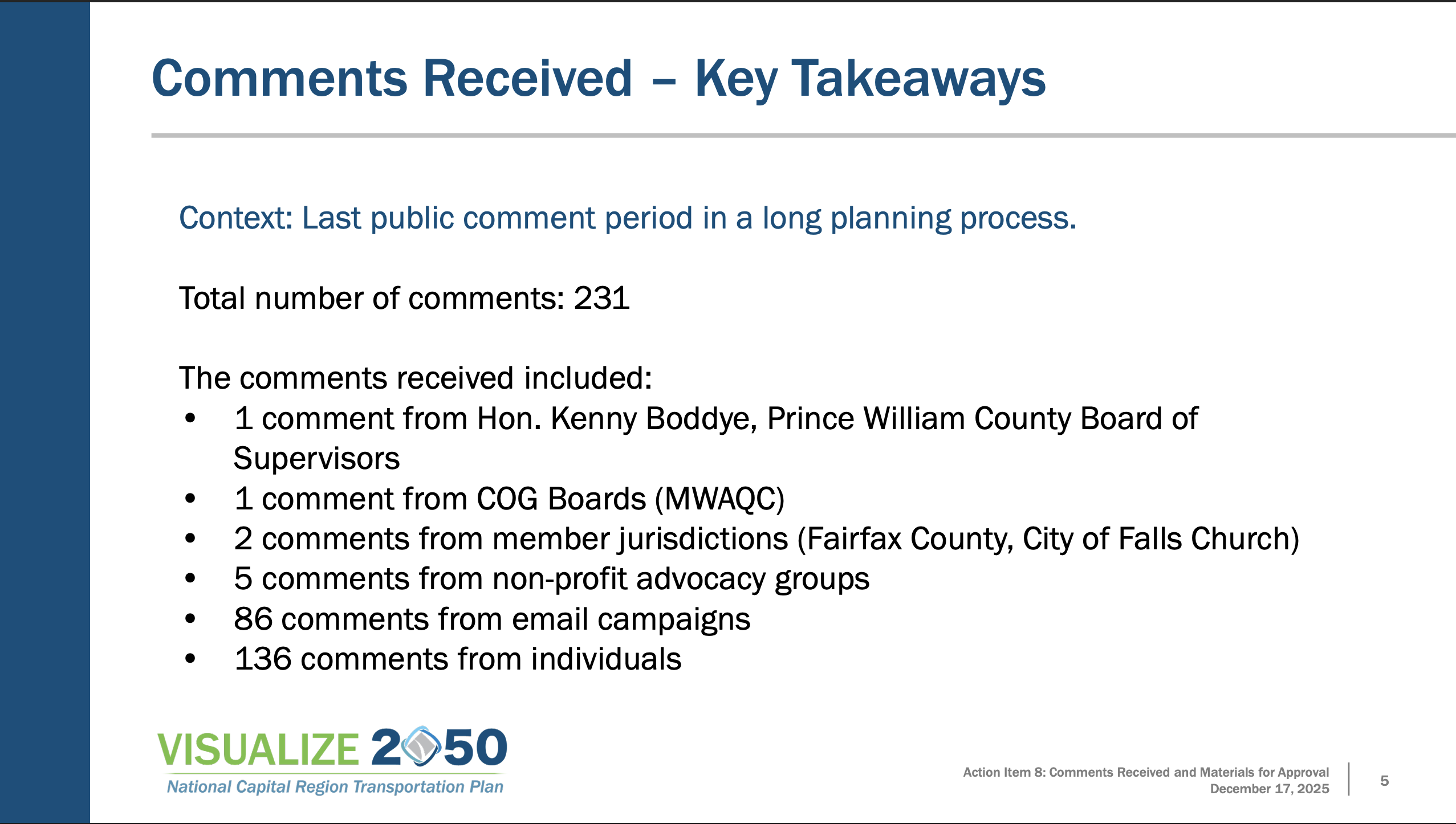 The final public comment period, held Oct. 23 through Nov. 21, drew 231 comments from elected officials, advocacy groups, and residents. Major themes included calls for more ambitious climate goals, expanded transit service, and opposition to highway widenings and toll lanes.