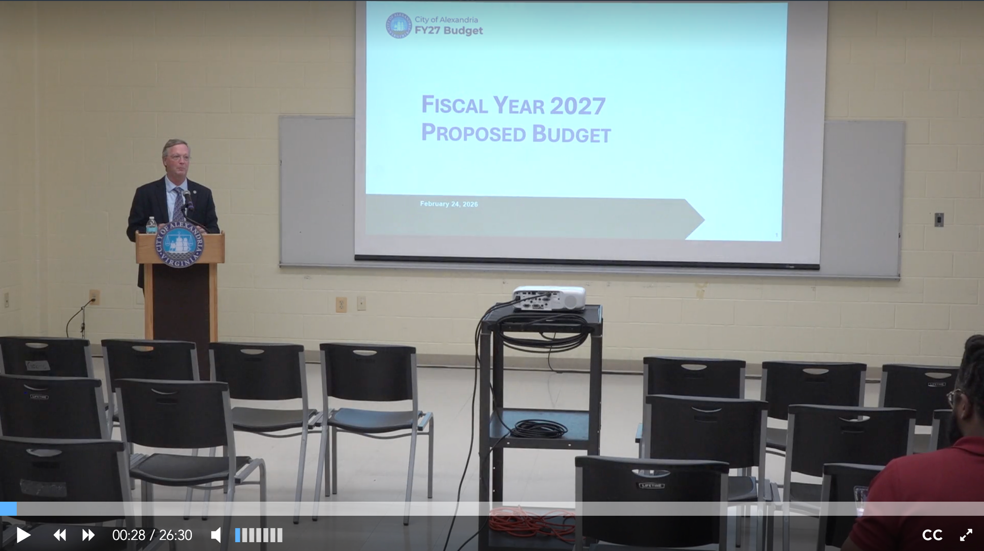 The following evening, Parajon presented the proposed budget to the public at Charles Houston Recreation Center. The session was available in person and via Zoom. Parajon covered the highlights of the proposed budget in approximately 26 minutes, with no public questions recorded. He described the budget's central message as "steady progress," noting that the proposal does not raise the real estate tax rate, eliminates 45 vacant positions, and directs 32% of all new city funding to ACPS. The average homeowner will pay approximately $26 more per month due to rising assessed values at the unchanged tax rate.
