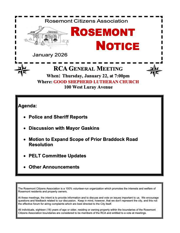 The RCA meeting is scheduled for 7 p.m. Thursday, January 22, at Good Shepherd Lutheran Church, 100 West Luray Avenue. The agenda also includes a discussion with Mayor Alyia Gaskins, police and sheriff reports, and PELT committee updates.