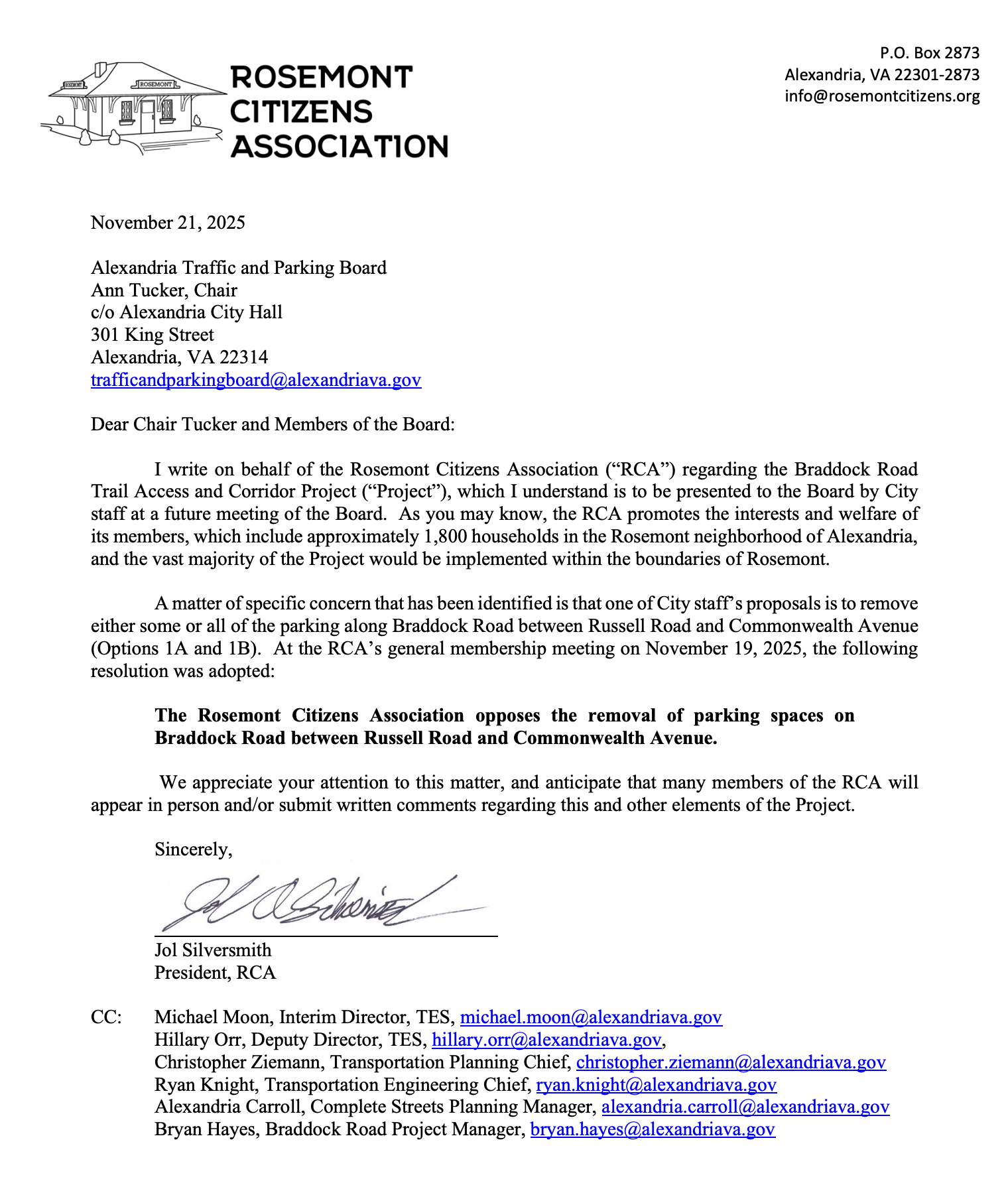 The day after The Alexandria Brief’s November story published, Silversmith sent a formal letter to the city’s Traffic and Parking Board stating “the Rosemont Citizens Association opposes the removal of parking spaces on Braddock Road between Russell Road and Commonwealth Avenue.”