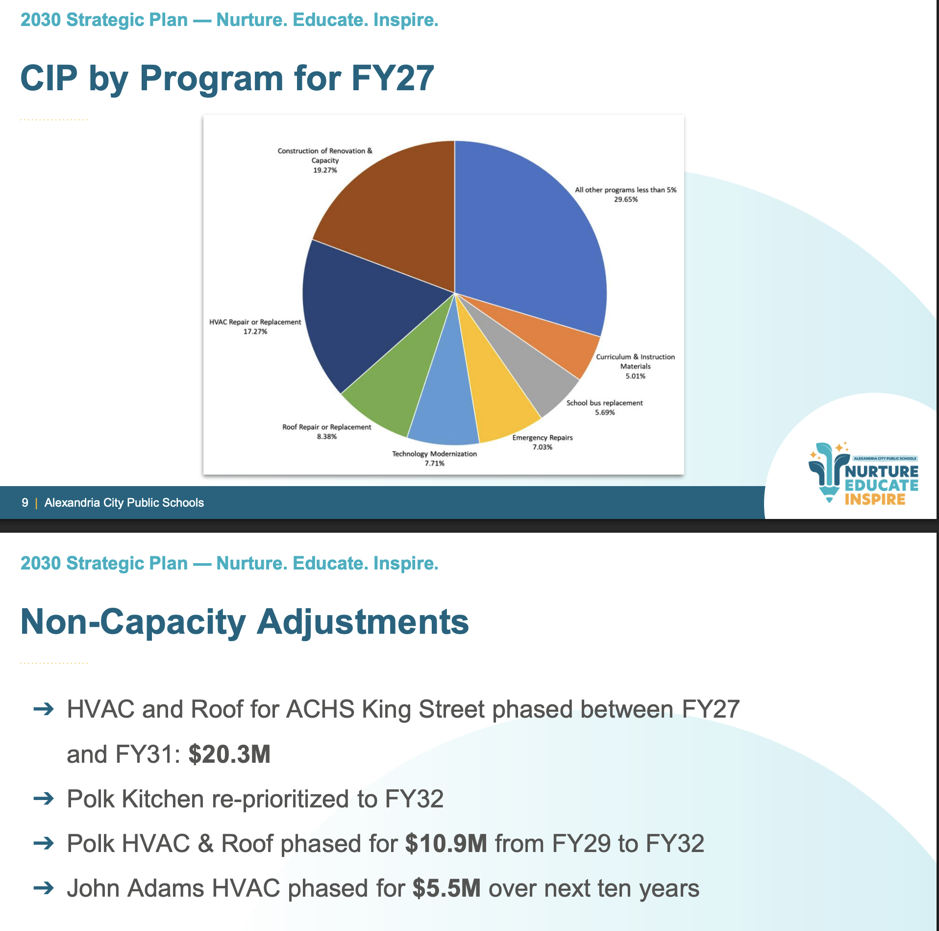 The Cora Kelly modernization remains the largest single investment at $105 million across the 10-year period. The budget proposes converting Jefferson-Houston into an 850-student middle school, with $2.7 million for design in fiscal year 2030 and $27.5 million for construction in fiscal year 2031. Patrick Henry would become a K-5 elementary school, with $858,000 for design in fiscal year 2031 and $8.6 million for construction in fiscal year 2032.