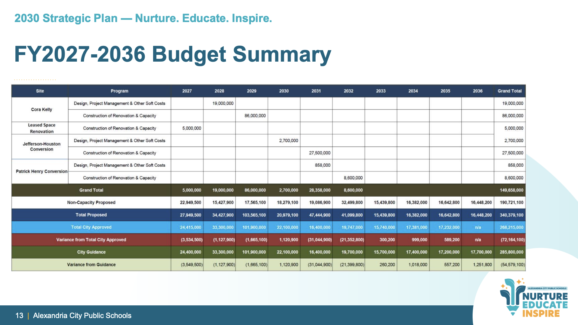 The proposed 10-year capital plan totals $340.4 million, exceeding city guidance by $54.6 million. The largest variance occurs in fiscal year 2031, when the proposed budget exceeds guidance by $31 million, primarily due to Jefferson-Houston conversion construction costs.