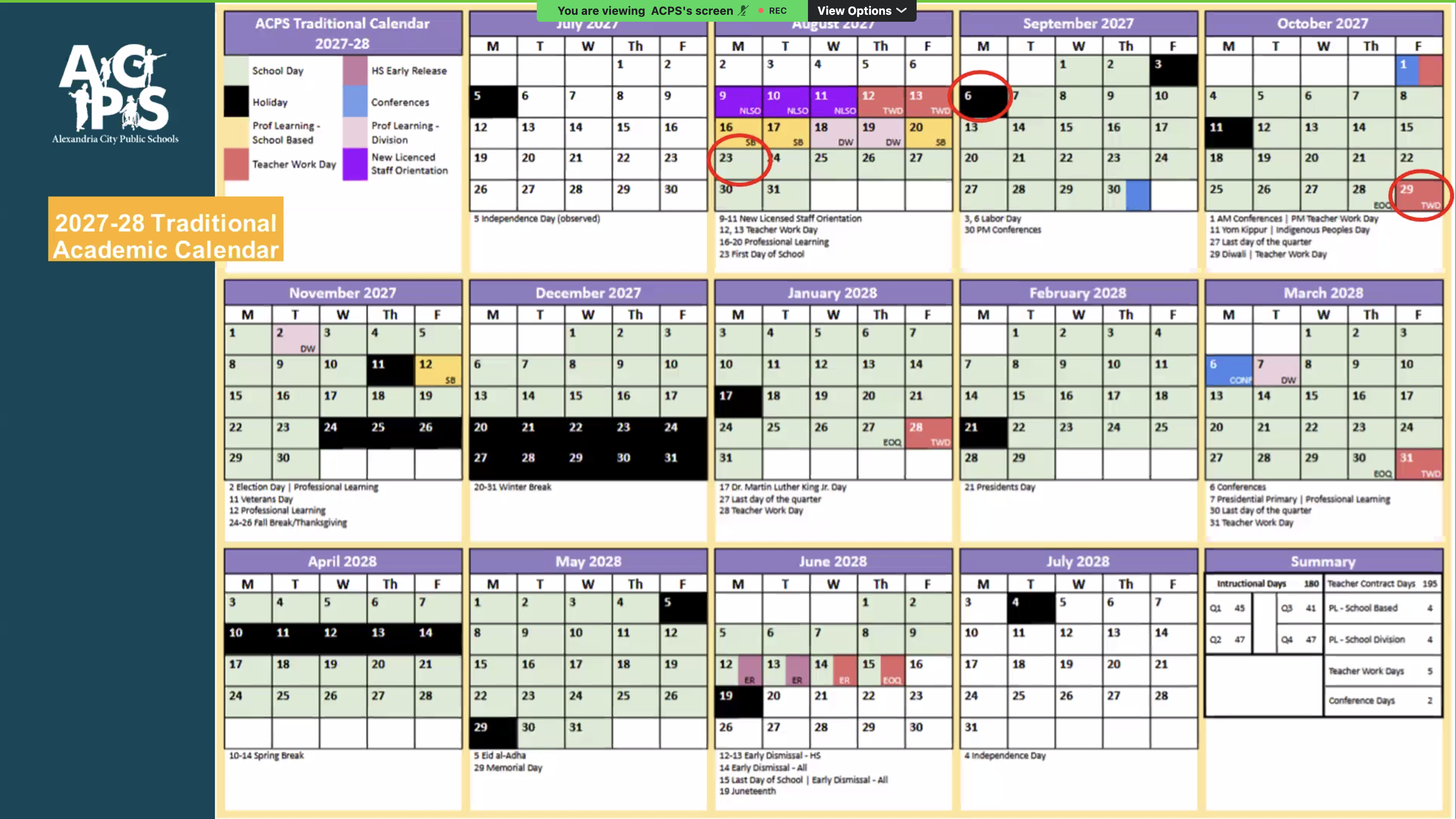 The board reviewed proposed academic calendars through 2028-29, with staff warning that scheduling difficulties are intensifying as the division balances instructional time against cultural observances.