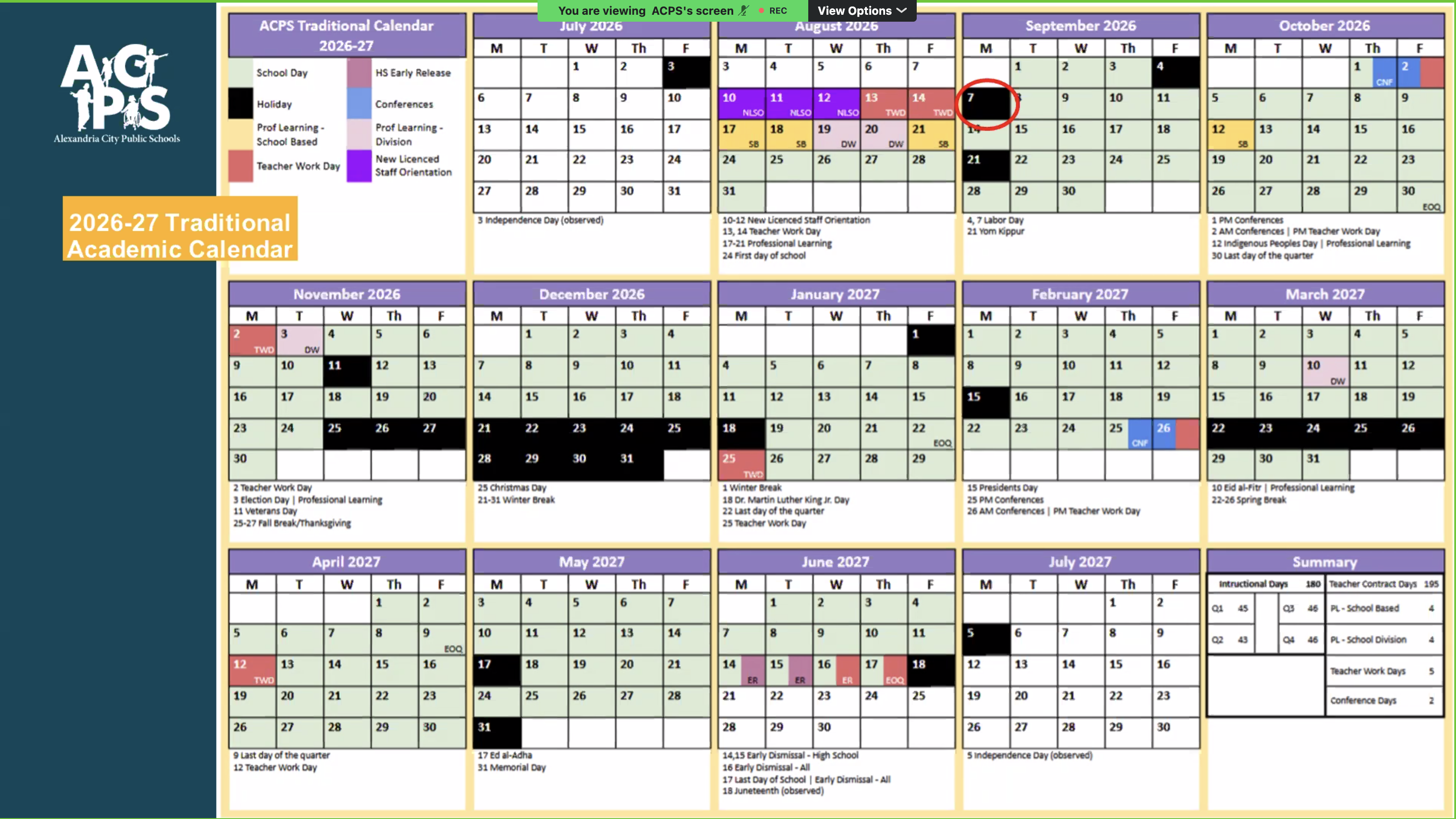 For 2026-27, students on the traditional calendar begin Aug. 24 and finish June 17. The 2027-28 calendar starts Aug. 23 and ends June 15, with spring break shifting from late March to mid-April.