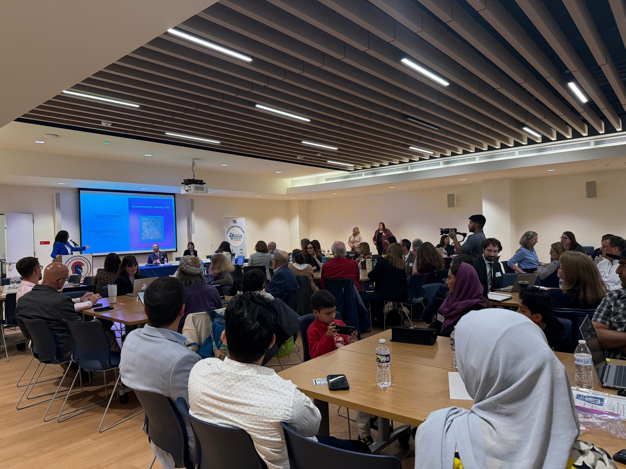 The room at Minnie Howard was arranged in ten tables of ten seats, with interpretation available in Spanish, Arabic, Amharic and Dari — reflecting the linguistic diversity of the region. A note-taker with a laptop captured feedback at each table throughout the evening, and state officials, including Smith and Conway, circulated from table to table rather than remaining at the front of the room, giving participants direct access to state leadership during each discussion round.