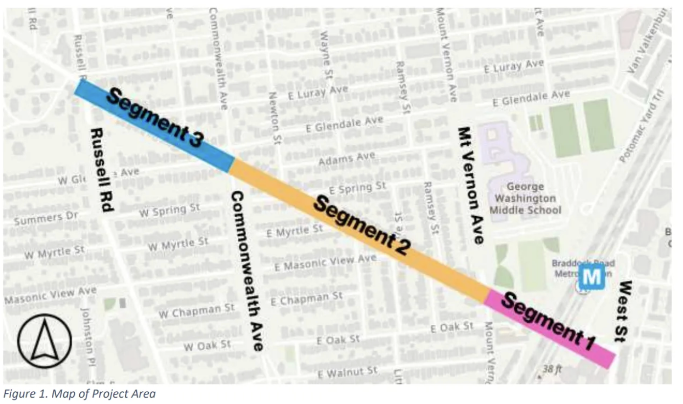 The city’s recommendation includes protected bike lanes along the entire corridor, removal of most on-street parking between Mount Vernon Avenue and Russell Road, and shorter pedestrian crossing distances. The project stems from a 2023 Safe Routes to School audit at George Washington Middle School, VDOT’s designation of the corridor as a safety priority, and crash data showing 17 crashes and 8 injuries between 2019-2023 — plus a pedestrian fatality in 2015.