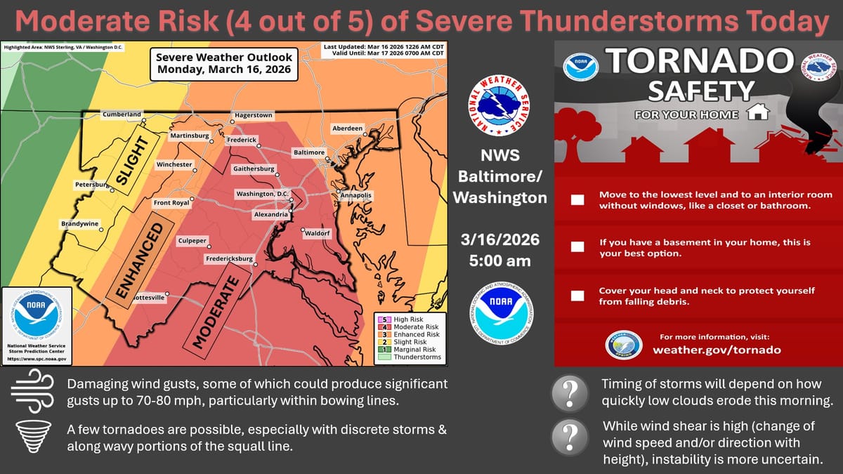 A dangerous storm system is bearing down on the region today, with the National Weather Service warning of severe thunderstorms capable of producing tornadoes and damaging wind gusts up to 80 mph this afternoon and evening. Alexandria City Public Schools is monitoring conditions and has not ruled out an early dismissal, while neighboring districts, including Arlington, Fairfax, and DC Public Schools, have already announced they will close early. Temperatures will swing from a high near 73 degrees this afternoon to a low around 31 tonight.
