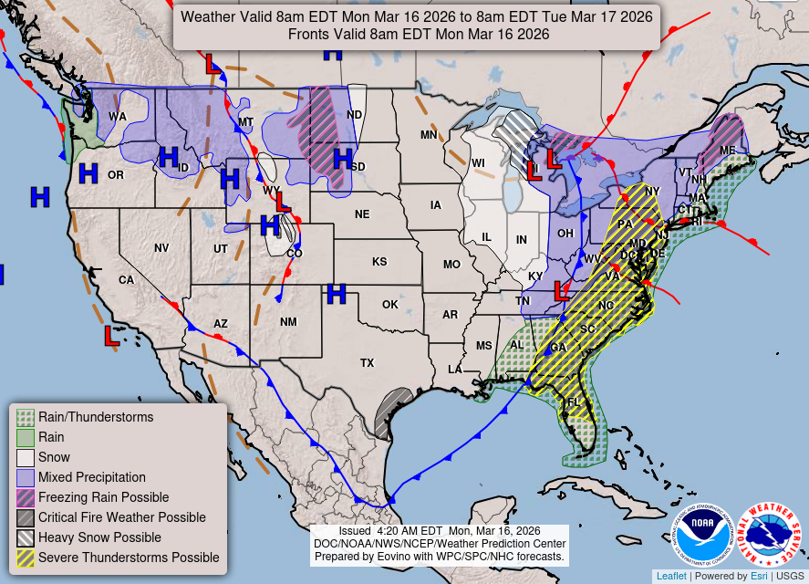 Showers and possibly a thunderstorm tonight before 11 p.m., then a chance of showers between 11 p.m. and midnight. Some of the storms could be severe. Low around 31 degrees. West wind 14 to 18 mph, with gusts as high as 33 mph. The chance of precipitation is 100%. New precipitation amounts between a quarter and half of an inch are possible.