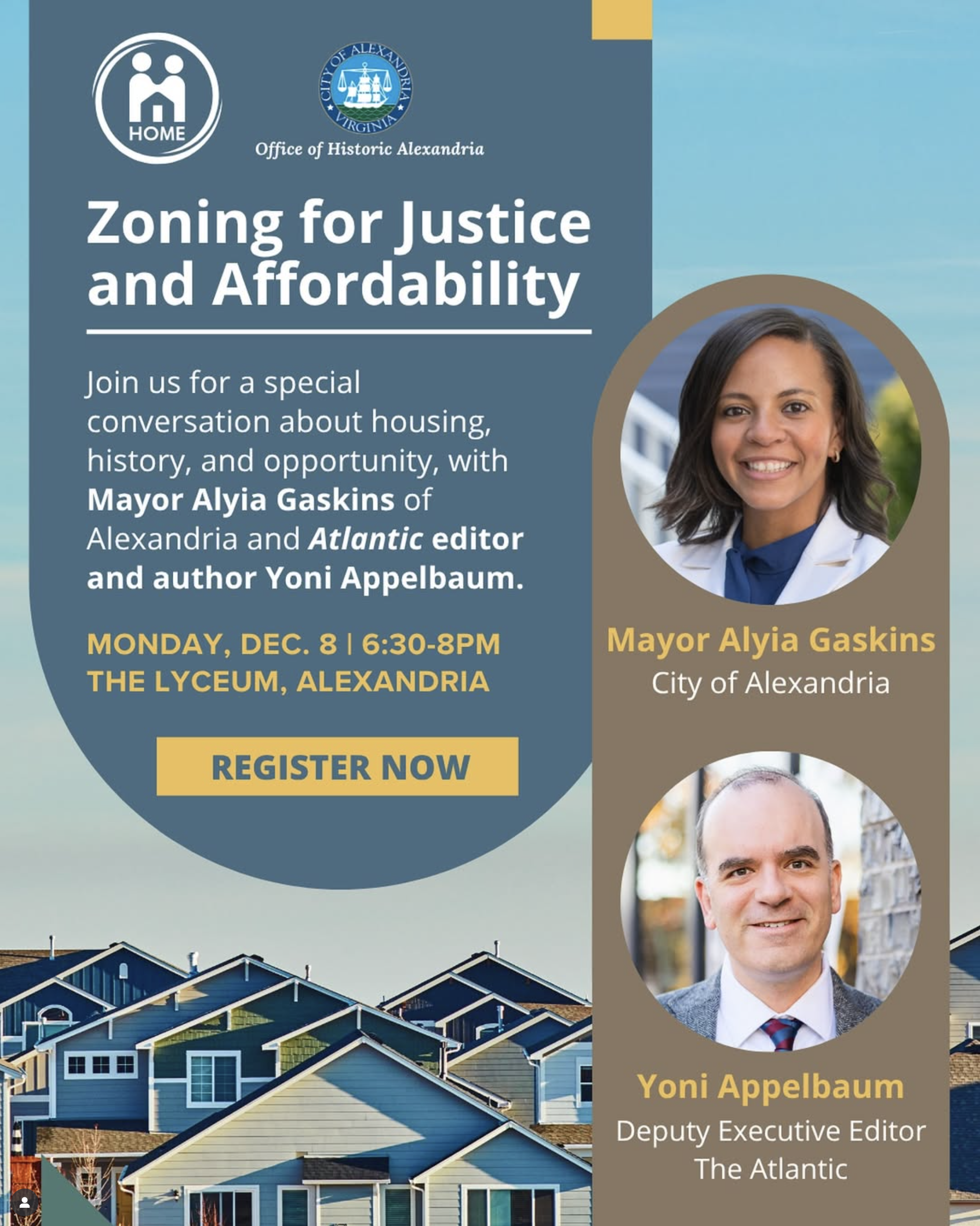 Mayor Gaskins will join journalist and author Yoni Appelbaum for a public forum on housing affordability and zoning reform on Monday, December 8, from 6:30 to 8 p.m. at the Lyceum, 201 S. Washington St.