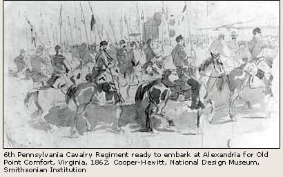 On April 1, 1862, the noted American landscape painter Winslow Homer was in Alexandria, sketching Union soldiers leaving the city for Fort Monroe as part of Major General George McClellan’s “Peninsula Campaign.” The drawing depicts “General McClellan's Sixth Pennsylvania Cavalry Regiment Ready to Embark at Alexandria for Old Point Comfort.” (Historic Alexandria)