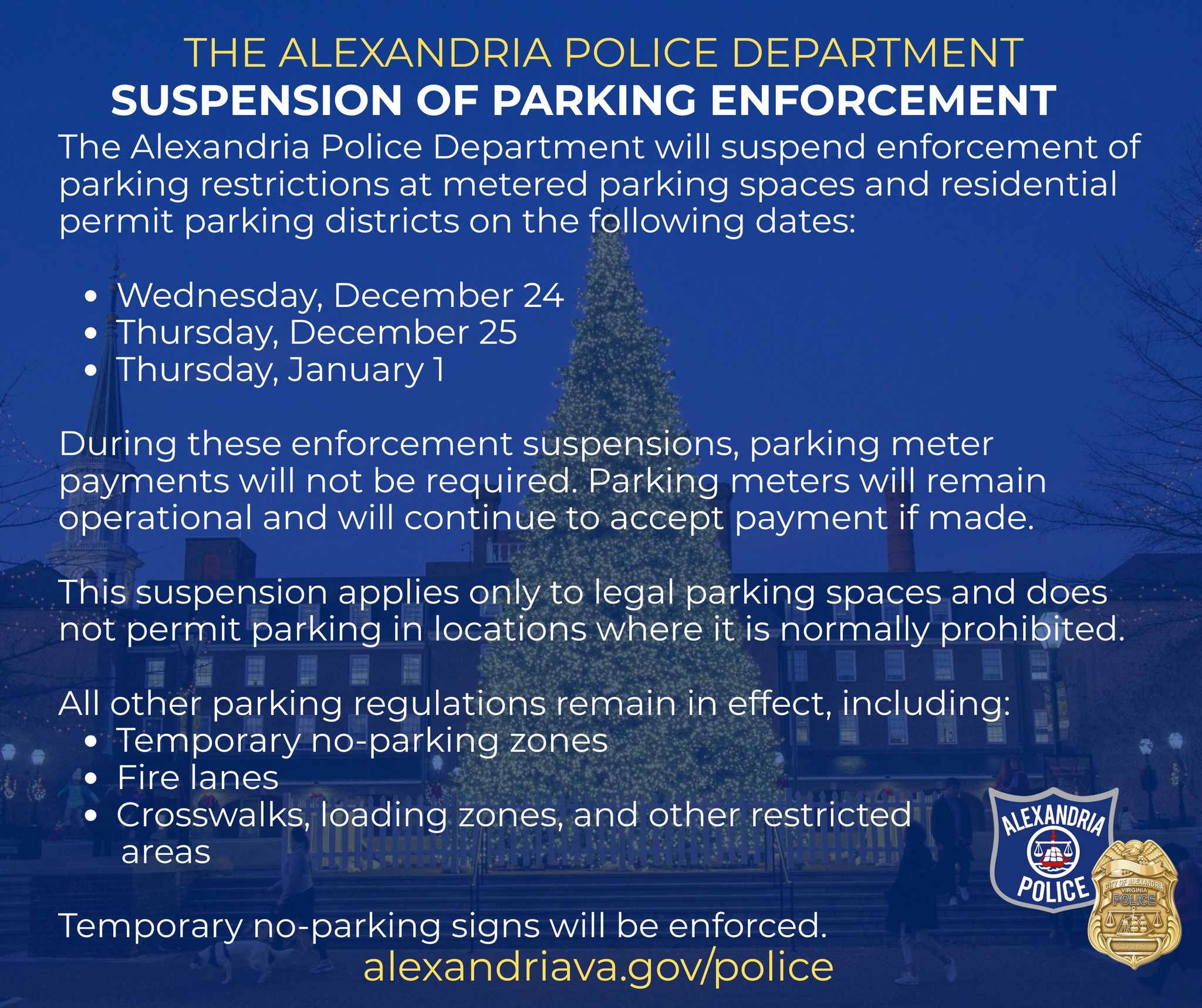 The Alexandria Police Department will suspend enforcement of parking restrictions at metered spaces and residential permit parking districts on Christmas Eve, Christmas Day and New Year’s Day. Parking meter payments will not be required during the suspension, though meters will remain active and accept payment if made.