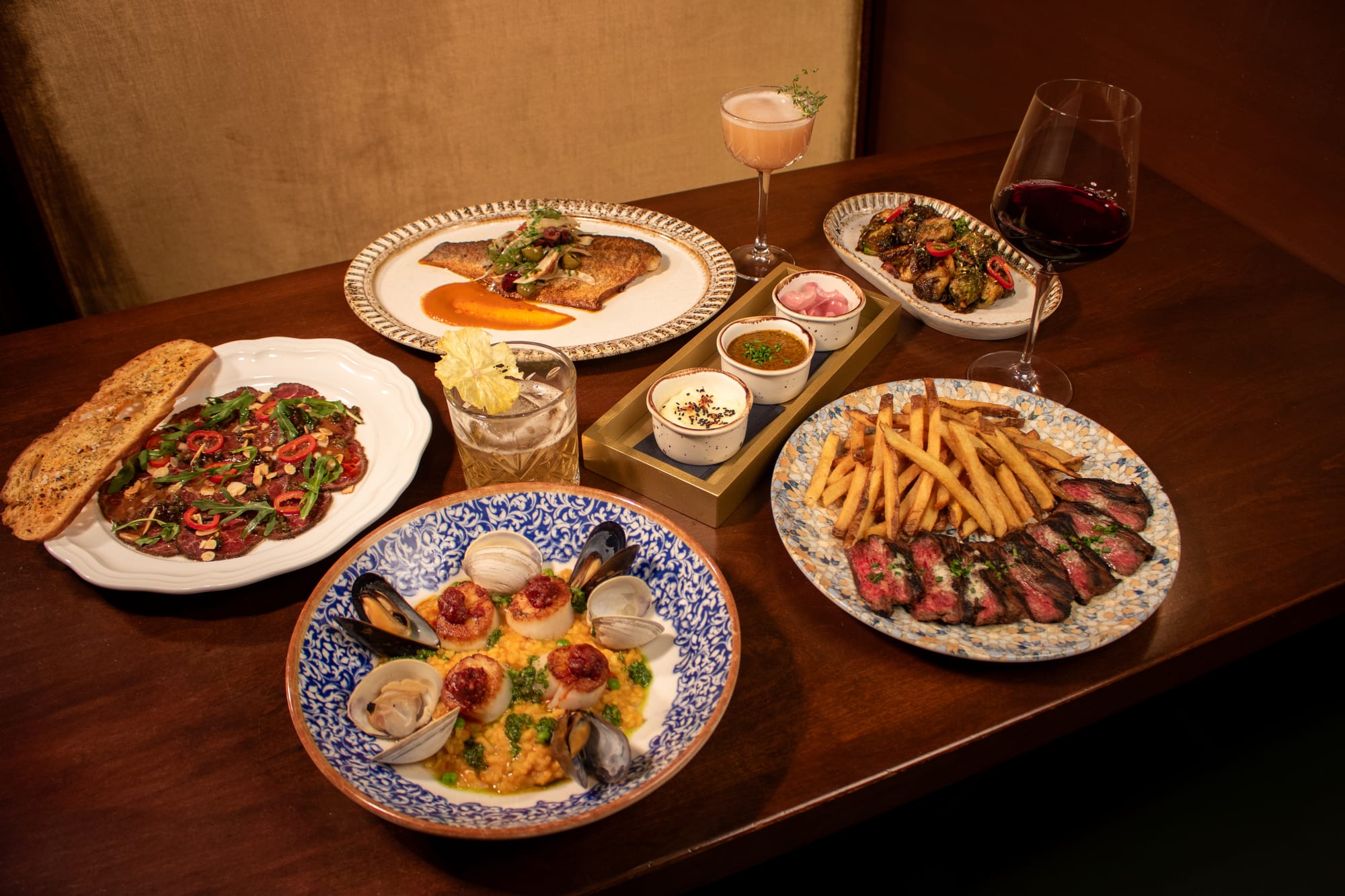 The cocktail program features signature drinks including the Saffron Spritz and Margarita Alla Caipirinha, alongside a wine list and classic spirits.