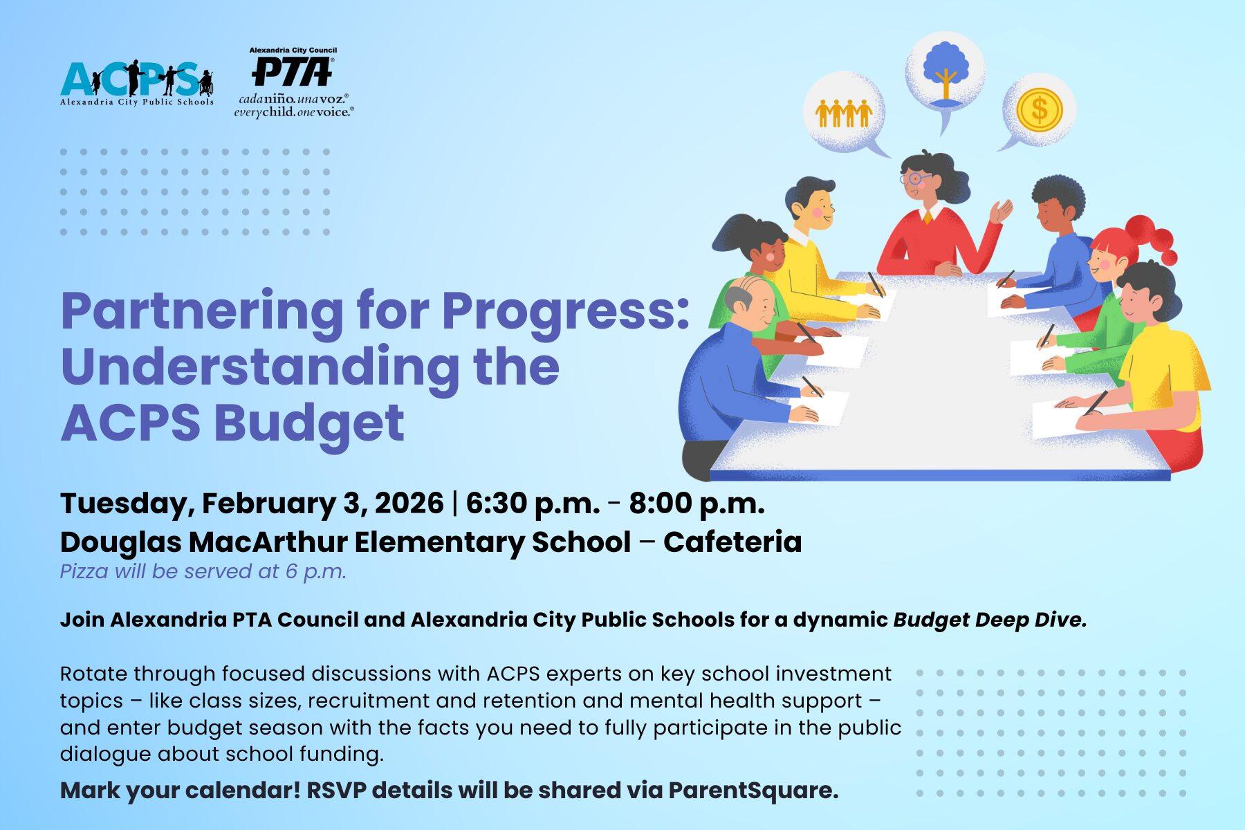 ACPS Budget Forum — 6–8 p.m., Douglas MacArthur Elementary School (1101 Janney’s Lane). Pizza at 6 p.m., forum 6:30–8 p.m. Interpretation available in Amharic, Arabic, Dari, and Spanish. Update - This has been rescheduled to February 9.