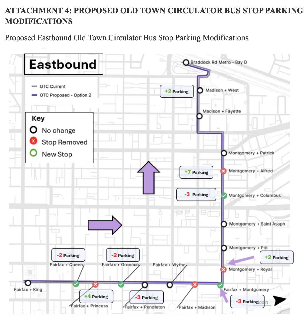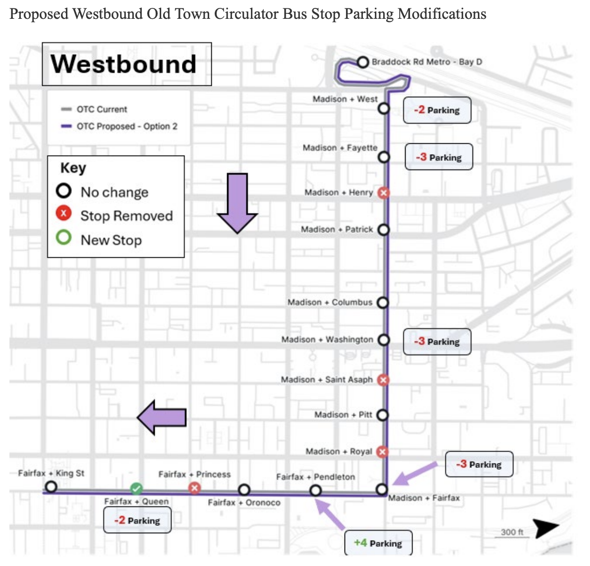 The board will also review proposed changes to bus stops and parking along the Old Town Circulator route on North Fairfax Street, Madison Street, and Montgomery Street. The plan would remove eight bus stops and add five new ones to improve spacing and accessibility. Staff are recommending removing up to 26 parking spaces across the three streets, while adding 19 spaces in other locations along the corridor.