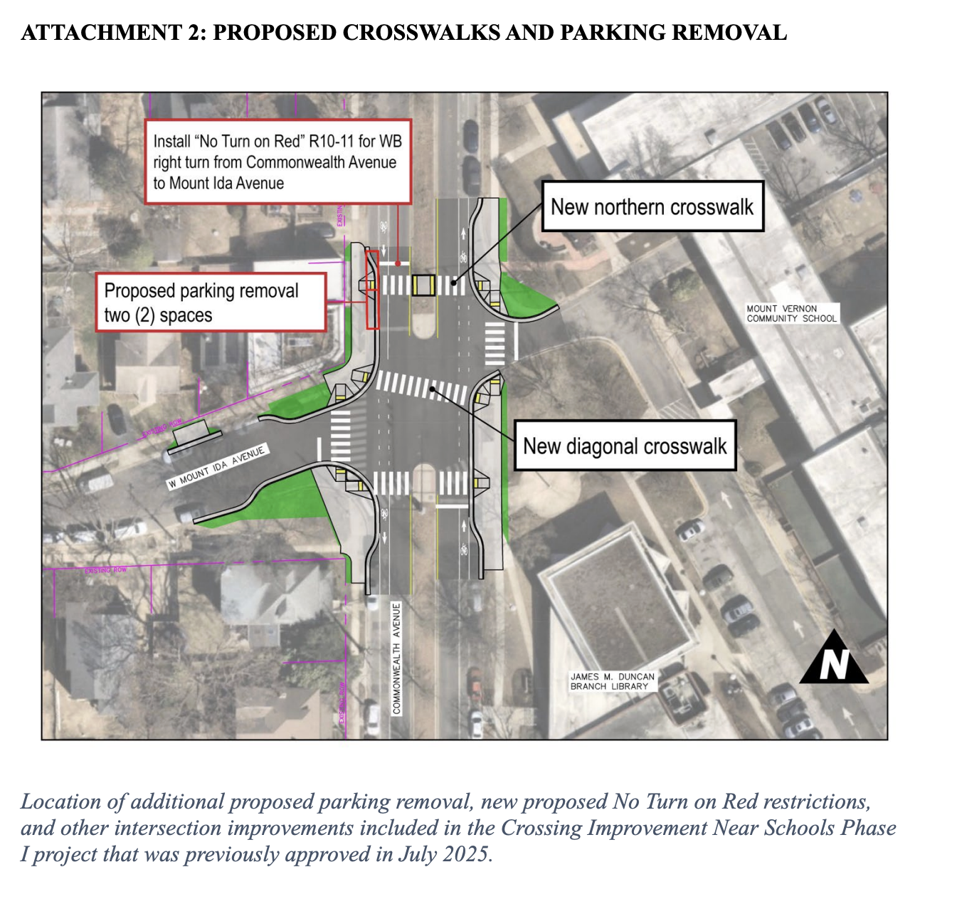 Staff is asking the board to approve the removal of two parking spaces at the intersection of Commonwealth Avenue and Mount Ida Avenue in Del Ray to accommodate new crosswalks serving Mount Vernon Community School, the James M. Duncan Branch Library, and the Mount Vernon Recreation Center. The project would add a northern crosswalk and a diagonal crossing at an intersection that currently lacks a crossing guard.