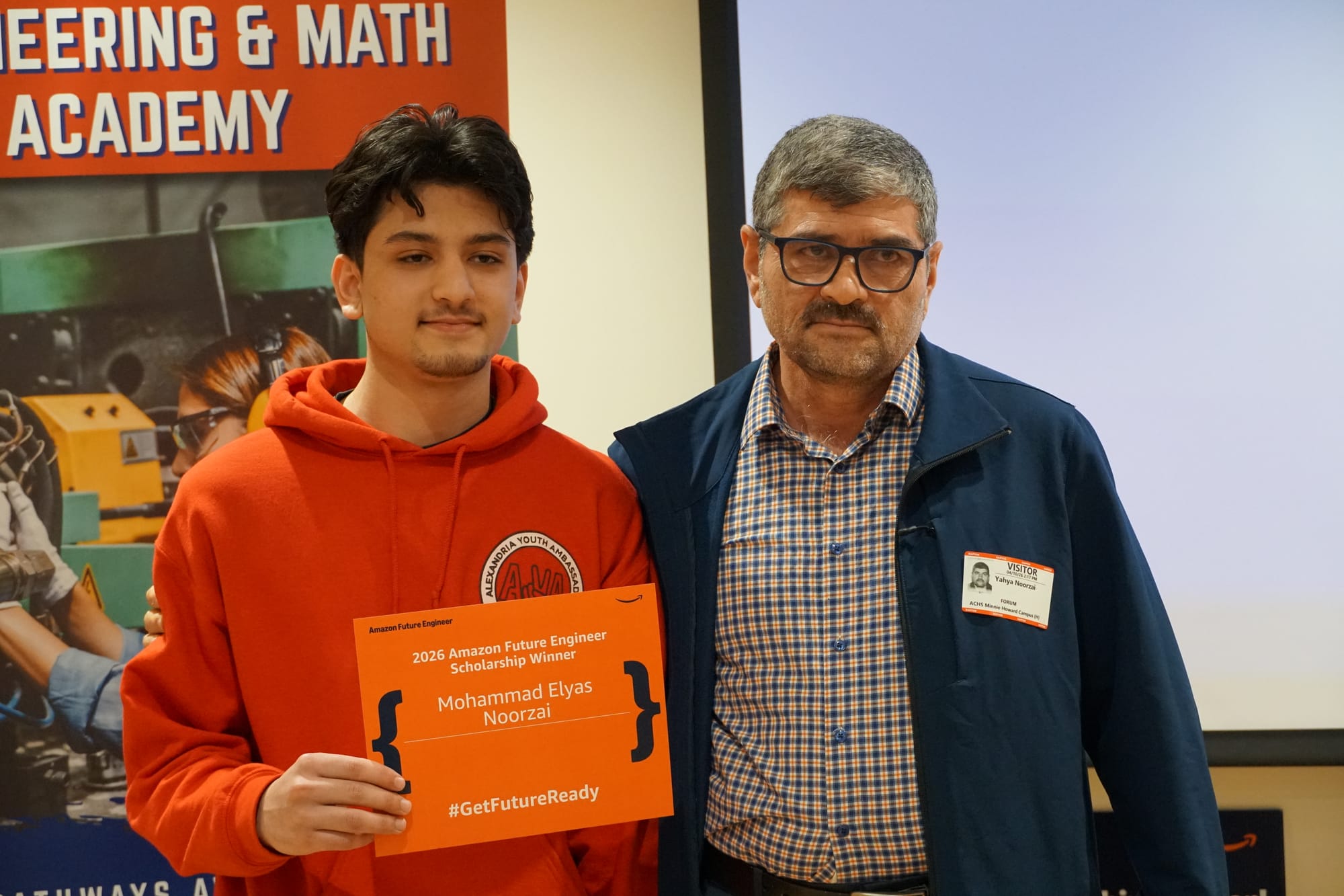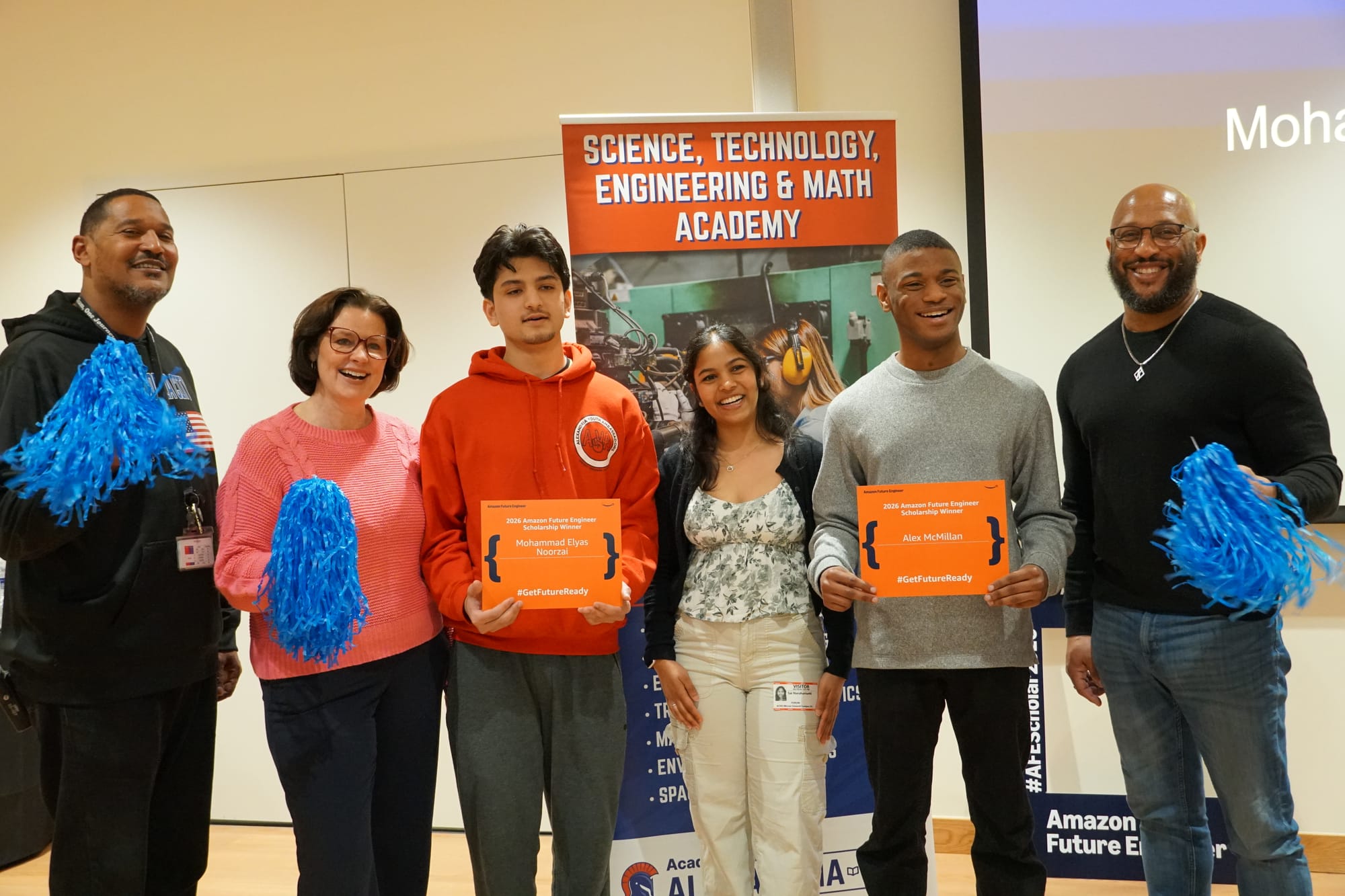 Mohammad Elyas Noorzai and Zhi McMillan each received the Amazon Future Engineers Scholarship, earning up to $40,000 and a guaranteed paid summer internship with one of the world's largest technology companies, in a surprise announcement before roughly 50 classmates, family members, and Alexandria City Public Schools staff.