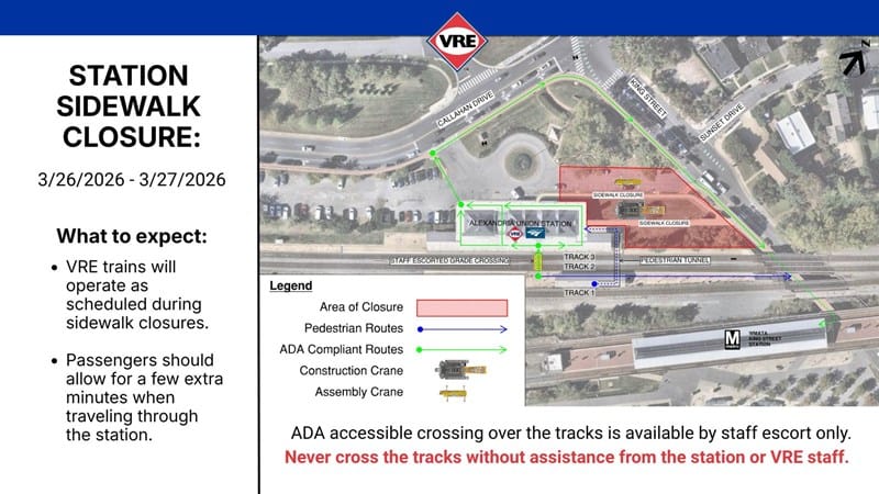 Through this evening, pedestrians at the station are being directed away from the normal ADA ramp and around to the front of the building, where Callahan Drive sidewalks provide access to King Street and Metro. VRE warned passengers to allow extra travel time. An ADA-accessible crossing over the tracks remains available but requires a staff escort. Normal pedestrian access resumes Saturday.