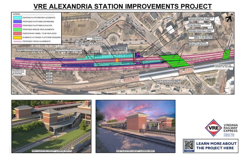For project updates, visit the VRE Alexandria Station project page. Residents seeking updates can contact VRE at AlexandriaStationImprovements@vre.org.