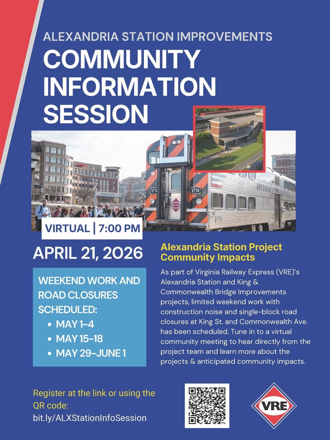 VRE — working in partnership with the Virginia Passenger Rail Authority and the city of Alexandria — says limited weekend construction work, including noise and single-block road closures at King Street and Commonwealth Avenue, has been scheduled across three windows this spring and early summer: May 1–4, May 15–18, and May 29–June 1.