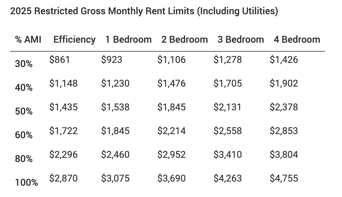 Housing is “affordable” if it costs no more than 30% of household income. The city publishes official rent limits for committed affordable housing based on this standard.